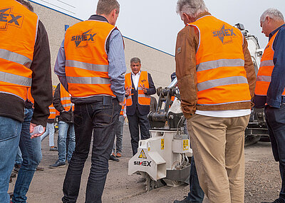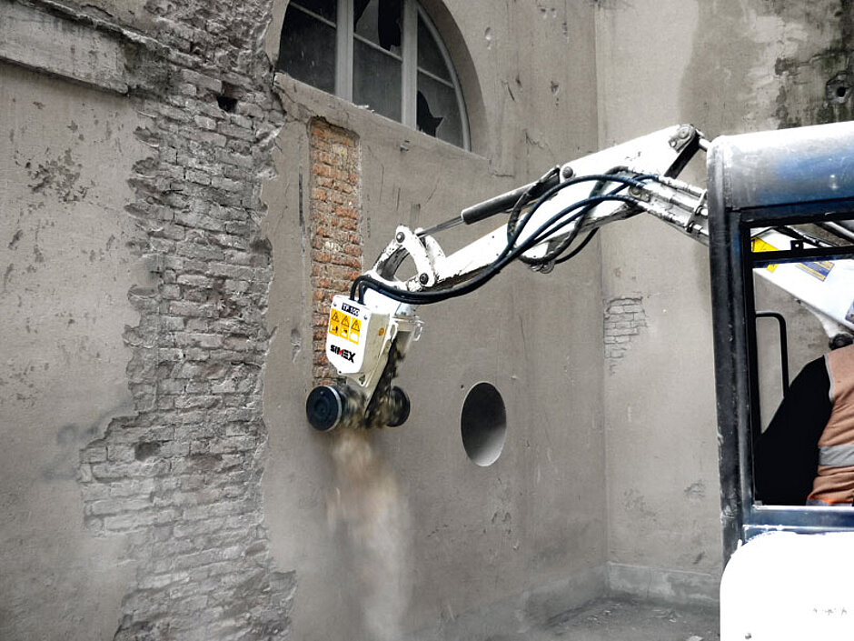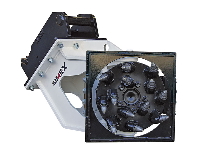 Für den Lösungsansatz in kleinen Räumen bietet Simex die Fräsen der Serie WG. Bei ihren drehen sich die mit Zähnen bestückten Scheiben um die eigene Achse. Eine Gelenkführung im Mittelpunkt der Scheibe soll eine immer gleichmäßige Oberflächenauflage beim Schwenken des Löffelstiels sicherstellen. Mit der Bewegung des Löffelstiels in vertikaler und horizontaler Ebene können, so Simex, sehr große Flächen bearbeitet werden ohne den Bagger versetzen zu müssen.