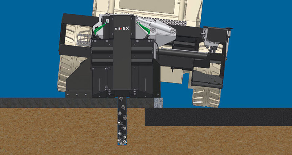 Eine spezielle Weiterentwicklung bietet Simex für den deutschen Markt an: Für die kapillare Glasfaserverlegung (FTTH – Fiber to the House) sollen die Glasfaserrohre soweit wie möglich im Gehsteigbereich eingebracht werden. Allerdings sind Gehsteige meist so schmal, dass die breiteren Trägergeräte wie Kompakt- oder Radlader fast zwangsläufig im Einsatz schräg stehen, weil zwei Räder auf dem Gehweg und die beiden anderen auf der Straße laufen. Um dennoch zur Herstellung eines vertikalen Grabens im 90°-Winkel fräsen zu können, hat Simex die Fräse RWA 500 mit einer Tiltfunktion ausgestattet. Die Radfräse kann zudem mit einigen weiteren Besonderheiten aufwarten. Das Fräsrad – mit dem sich stufenlos einstellbare Tiefen von 300 mm bis 500 mm fräsen lassen – ist mit austauschbaren Segmenten für Fräsbreiten von 50 mm bis 120 mm ausgestattet. Ebenso nivelliert sich die Fräse in Fahrtrichtung selbst, was saubere Fräskanten garantieren soll. Der Materialauswurf erfolgt entweder rechts und links oder einseitig, Auf Wunsch kann die Fräse auch mit einem Absaugstutzen ausgerüstet werden. §
