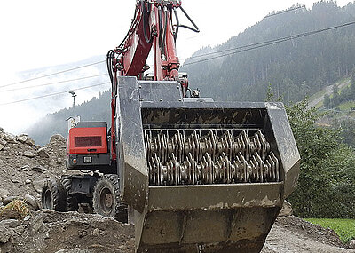 Das Besondere dabei: Aufgrund des patentierten Mechanismus’ kann der Abstand der Siebwellen von der Fahrerkabine aus verändert werden. Somit konnte das Material vom Fahrer direkt in unterschiedlichen Korngrößen aufgehäuft werden. Wie große Felsstücke aus der Wand gebrochen werden, das wurde mit dem Vibrationsripper RV 5000 von Socomec eindrucksvoll vorgeführt. Ein großer Vorteil dieses 5-t-Gerätes ist, so Socomec, dass er im Gegensatz zu vergleichbaren Geräten beim Anlaufen nicht aufgesetzt werden muss. ß