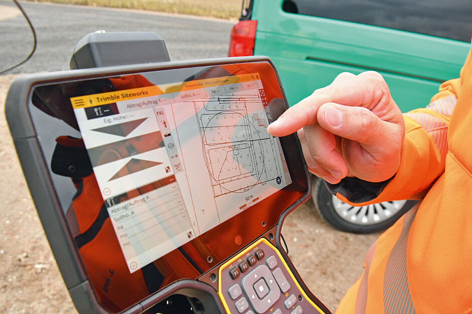 Eine Perspektive tat sich auf, als Scheele Erdbau mit Joel Jung einen Vermesser für die Bauvermessung und Abrechnungen einstellte, der zusammen mit Sitech einen Plan für die Einführung digitaler Bauprozesse entwickelte. Für die täglichen Vermessungs- und Absteckarbeiten wurde zunächst ein Roversystem mit dem GNSS-Empfänger SPS986 von Trimble und dem Trimble-Feldrechner TSC7 beschafft. Mit der Feldrechner-Software Trimble Siteworks konnten eigene Pläne erstellt und mit Trimble Business Center für die Maschinensteuerung ausgegeben werden. Der Einstieg in die Maschinesteuerung erfolgte mit einem 2D-System GCS900 von Trimble für eine Raupe. Mit der Lasersteuerung konnten präzise Planien erstellt werden und das Personal gewann erste Erfahrungen mit dem Steuerungssystem. Zügig wurde auf ein 3D-System Trimble Earthworks mit GNSS-Positionierung aufgerüstet und wurden zwei neue Bagger direkt mit 3D-Steuerung bestellt. Die Korrekturdaten wurden mit einer Trimble-Basisstation des Typs SPS855 und Trimble VRS Now bereitgestellt. Die Maschinenfahrer und auch Joel Jung wurden von Sitech eingewiesen und vom Sitech-Support bei Anwenderfragen unterstützt.