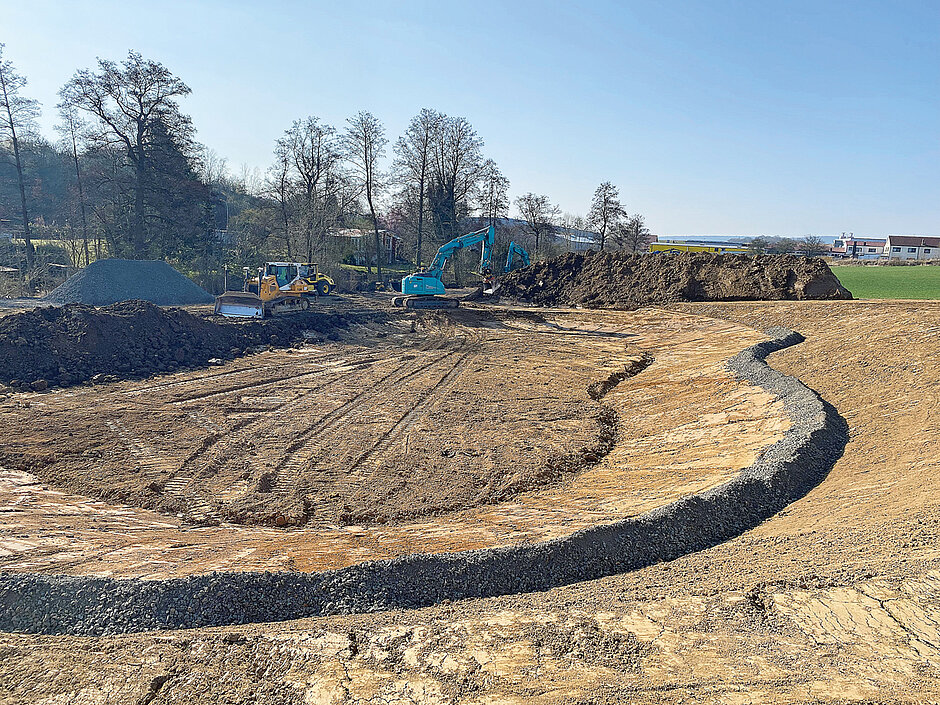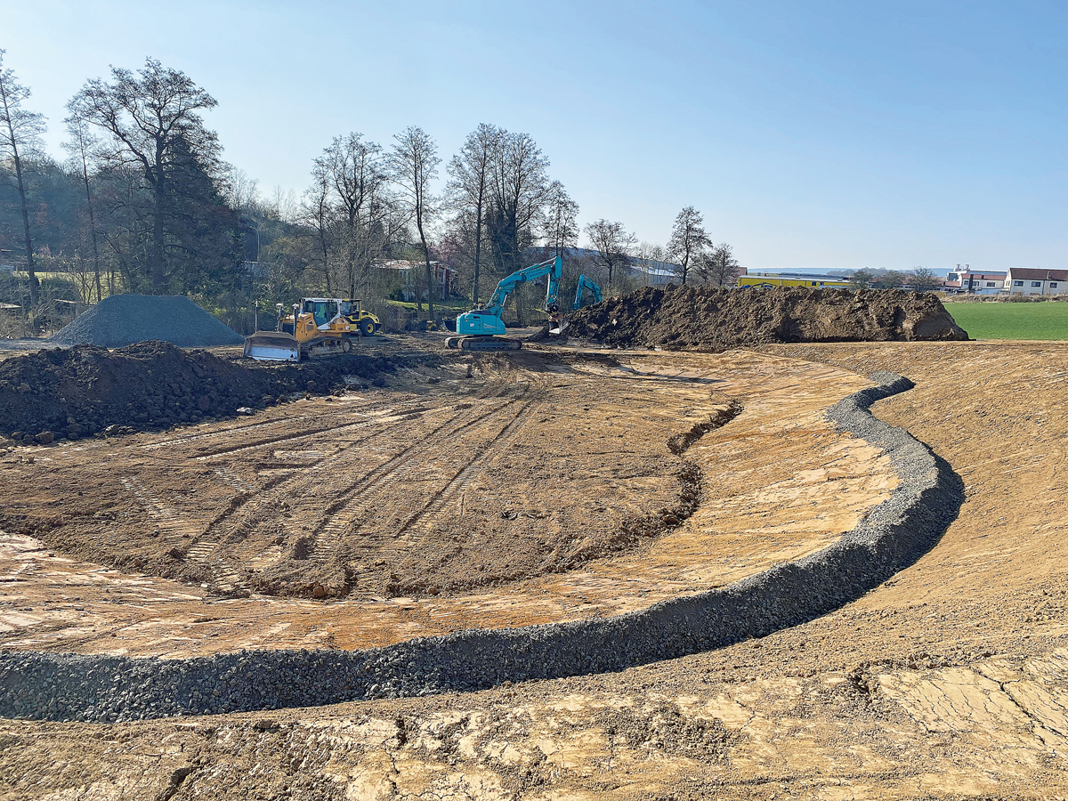 Das Bauunternehmen Baustra aus dem Siegerland profitiert von 3D-Maschinensteuerungen und einer integrierten Arbeitsweise beim Bau eines Regenrückhaltebeckens in Langgöns (Hessen).