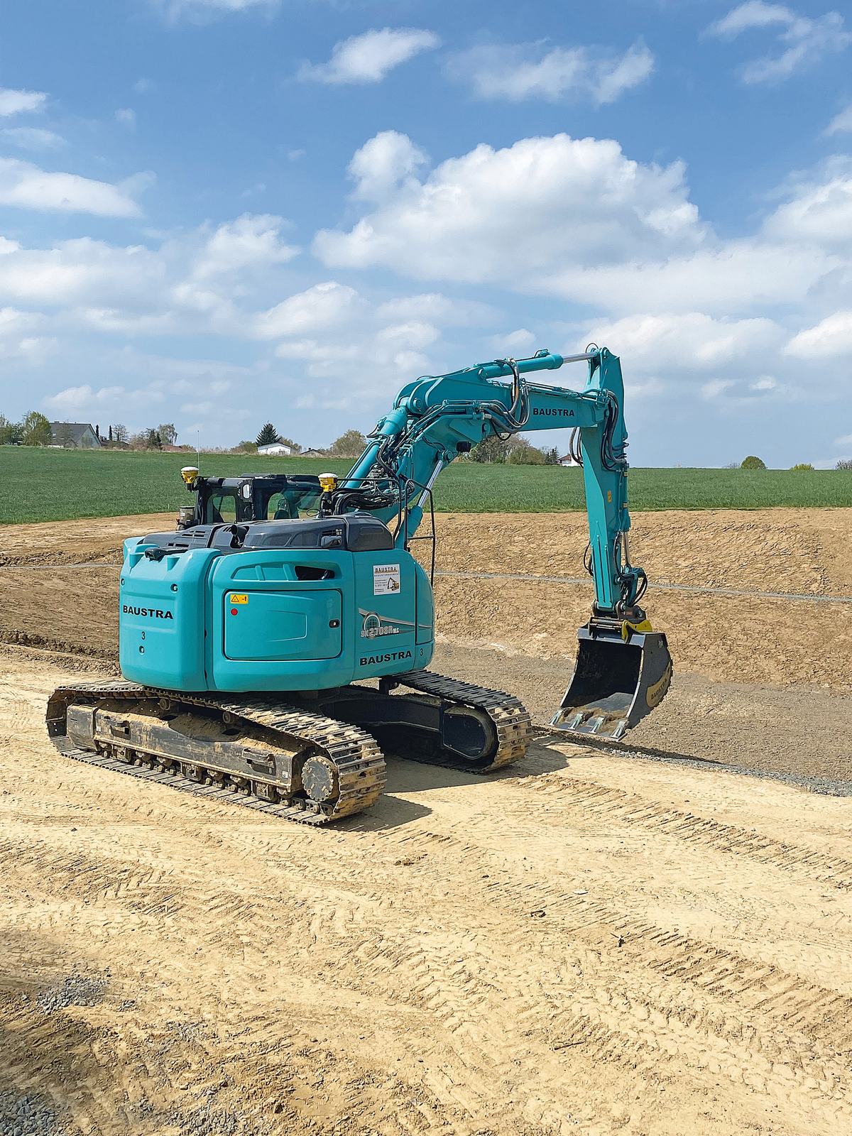 Das Projekt wird auf Basis eines Digitalen Geländemodells (DGM) eines Ingenieurbüros umgesetzt. Die Aufnahme des Urgeländes und die Datenaufbereitung für die Maschinensteuerungen erfolgte durch Baustra selbst. Auf der Baustelle kamen eine Raupe mit 3D-Steuerung sowie zwei Kobelco-Bagger mit Trimble Earthworks in Dual-GNSS-Konfiguration zum Einsatz. Mit den Maschinensteuerungen konnten die Böschungen in einem Zug nach dem DGM und ohne Herantasten an die Endform erstellt werden – inklusive der Deckschicht aus Mutterboden. Das Einmessen und Aufbauen von Böschungslehren oder Pflöcken und zwischenzeitliches Vermessen entfiel. Weil die Endform der Wälle und Böschungen nach dem Geländemodell erstellt werden können, entfielen auch Nacharbeiten und erneutes Befahren des Geländes, was aufgrund der Bodengeologie mit einem steinfreien Untergrund bei Regen auch gar nicht möglich war. Ungünstige Witterung konnte den Baufortschritt also nicht mehr beeinträchtigen. Die Übertragung aktueller Daten vom Büro auf die Maschinen und die Kontrolle des Baufortschritts erfolgen mit modernen Projekt-Management-Tools wie Trimble-Works-Manager.