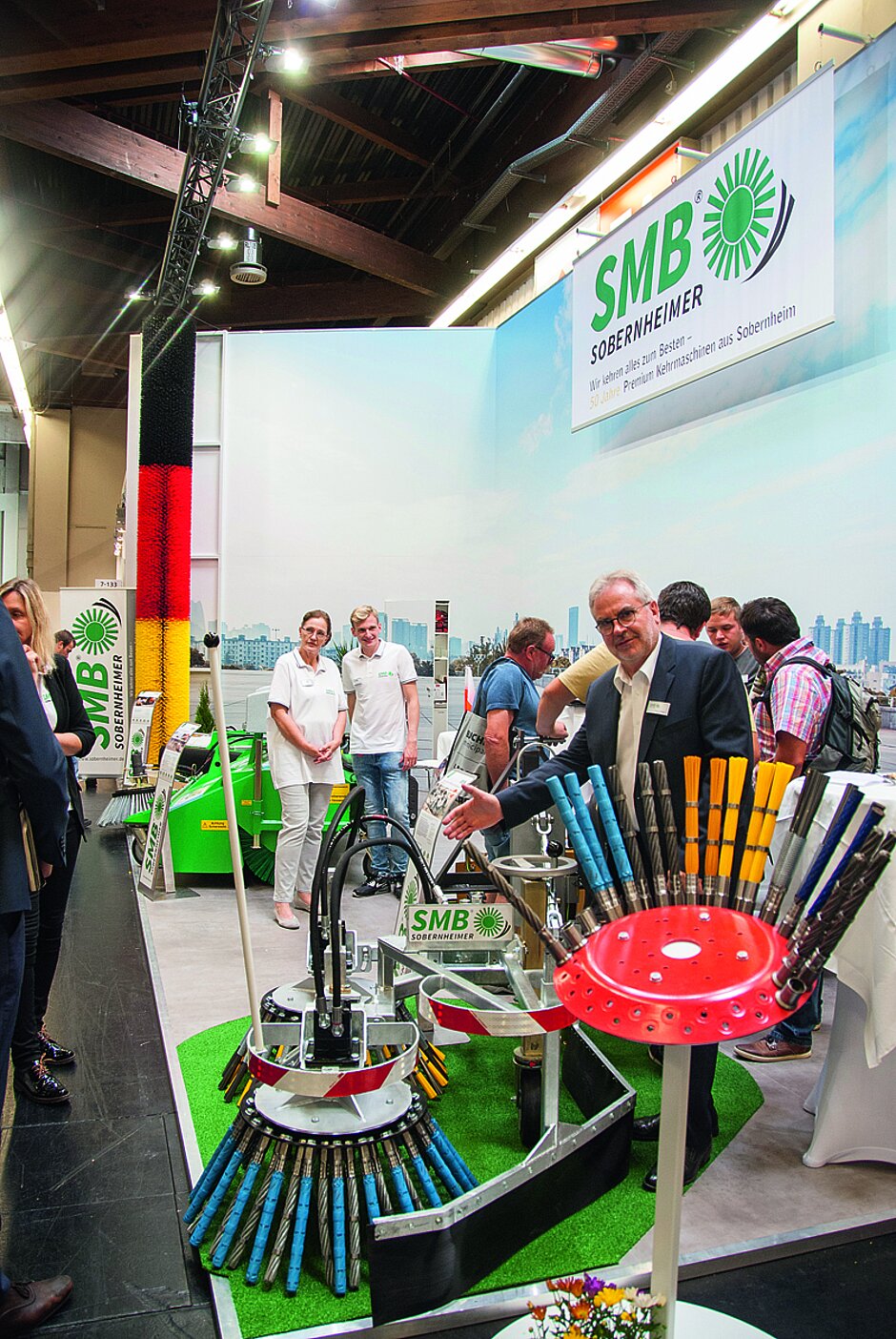 Vertrieben werden die Kehrmaschinen vornehmlich über Händler, während Großkunden direkt vom Unternehmen betreut werden. Auf der GaLaBau hat Sobernheimer eine Weiterentwicklung der schon in den 1990er-Jahren produzierten Wildkrautbürste WWE 120 präsentiert, »die aber praktisch eine neue Maschine ist«, so Tom Dilger. Dieses kehre »nicht radial, sondern tangential mit zwei Duplex-Tellerbesen«. Diese mechanische Lösung sei die effektivste und nachhaltigste Art der Wildkrautentfernung. ß