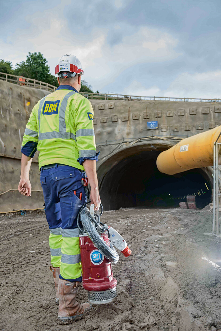 Die Wasserhaltung gestaltet sich ebenfalls unterschiedlich: Sie ist auf 30 l/Sek. ausgelegt, derzeit fallen rund 5 l/Sek. an. Da der nördliche Abschnitt ein Gefälle aufweist, kann das Wasser ohne Pumpenunterstützung ablaufen. Der südliche Abschnitt hingegen steigt an, sodass hier abgepumpt werden muss. Dazu bedient sich Porr seines langjährigen Partners Söndgerath, mit dem seit mehr als zehn Jahren eine enge Zusammenarbeit besteht. Von ihren Tauchmotorpumpen des Typs SPT 222 sind derzeit 20 Einheiten im Einsatz. Diese Schmutzwasserpumpen wurden für härteste Bedingungen entwickelt, wie sie für den Einsatz im Bergbau typisch sind. Weitere sechs Hochdruckpumpen des Typs SPT 4110 ergänzen den Pumpenpark. Bei derartigen Projekten müssen die Aggregate für die Wasserhaltung absolut ausfallsicher sein. Das bieten die eingesetzten Pumpen zuverlässig, denn sie arbeiten ohne Elektronik und sind für den Dauerbetrieb ausgelegt. Sicherheitshalber sind an beiden Portalen »Havarie-Kits« bereitgestellt, um im Notfall ein Überfluten des Tunnelabschnitts zu verhindern.