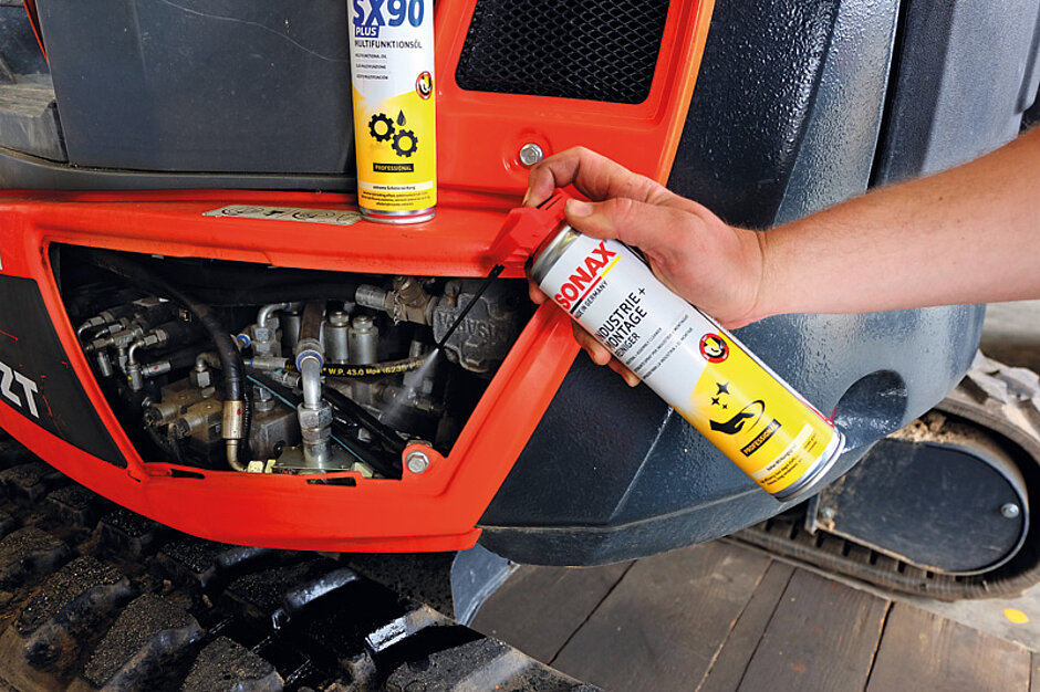 Nach dieser Vorbehandlung wird die Baumaschine in die Werkstatt des Händlers gebracht. Dort werden innen wie außen weitere Detailreinigungen vorgenommen. Der »Sonax-Professional-Bremsen- und Teilereiniger« kommt dabei ebenso zum Einsatz wie der »Professional Multi-Reinigungsschaum«, der Anhaftungen wie Öl, Fett, Silikon, Ruß oder Nikotin löst. Wenn öl- oder fettverschmutzte Maschinenteile gereinigt werden müssen, vertraut das Serviceteam auf den schnelltrennenden »Sonax-Kaltreiniger«.