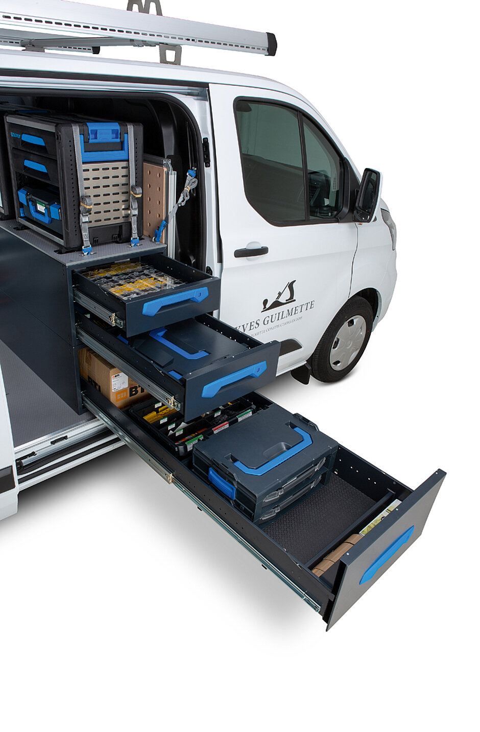 Dank robuster Bauweise und hoher Zuladung von bis zu 100 kg erlaubt die Jumbo-Unit, schwere Gerätschaften und unhandliches Ladegut schnell und sicher im Fahrzeug zu verstauen. Die Jumbo-Unit wird in den neuen Systemtiefen »14« (1 409,4 mm) und »16« (1 617,4 mm) sowie in einer neuen Korpushöhe mit 21 Rastern (357 mm) angeboten. Durch die neue Breite »2,5« (612,4 mm) soll der Laderaum noch besser ausgeschöpft werden, um eine maximale und effektive Laderaumnutzung in sämtlichen Transporterklassen zu ermöglichen. Die Großraumschubladen können längs oder quer verbaut werden. Starke Teleskopschienen mit weitem Auszug erlauben ein ergonomisches Be- und Entladen über das Fahrzeugheck oder die Seitentür. So können insbesondere schwere Gerätschaften und unhandliches Ladegut bis 100 kg in den Großraumschubladen verstaut werden, ohne ins Fahrzeug steigen zu müssen. Griffmulden erlauben neben einer einfachen Handhabung auch einen schnellen Zugriff auf den Inhalt, selbst beim Tragen von Arbeitshandschuhen.