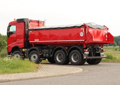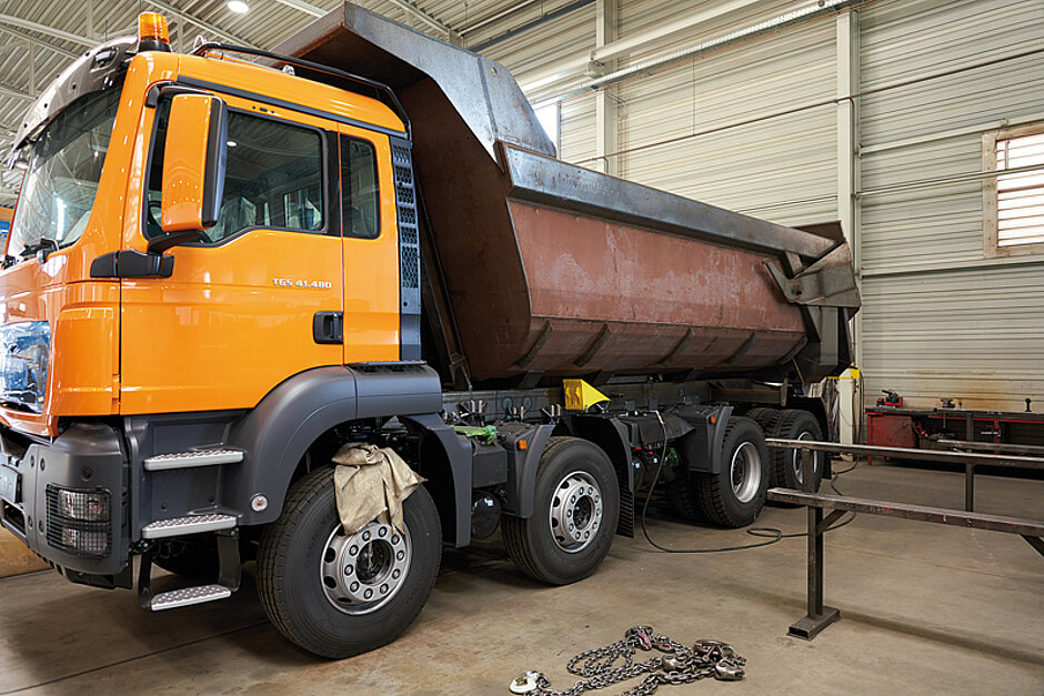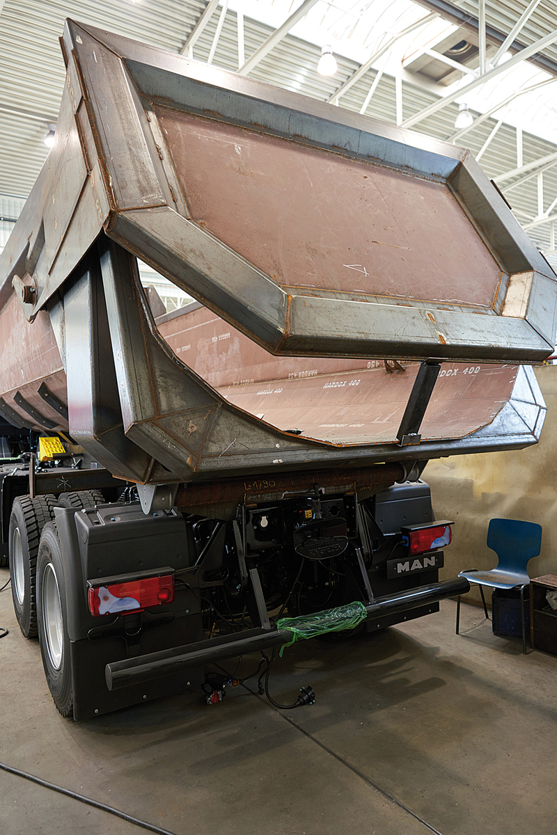 Die Wandstärke der Mulde aus Hardox 500 Tuf hatte man zudem um 1 mm auf 4 mm gegenüber der Hardox-450-Mulde reduziert gebaut. Neben dem geringeren Verschleiß verspricht Hardox 500 Tuf damit auch einen Nutzlastvorteil für den Anwender, der je nach Ausführung bis zu 20 % beträgt. Bei den unvermeidlichen Leerfahrten im Transportzyklus wird zudem weniger Fahrzeugmasse bewegt, was den Kraftstoffverbrauch des Lkw zu reduzieren hilft.