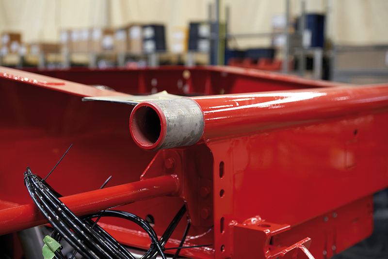 Strenx 960 Plus ist ein Konstruktionsstahl mit einer Streckgrenze von mindestens 960 MPa. Zu den typischen Anwendungen gehören anspruchsvolle lasttragende Konstruktionen wie hier im Fahrzeugbau. »Mit Strenx 960 Plus können wir eine Gewichtsreduzierung von an die 10 % im Fahrzeugrahmen erzielen. Gewichtsreduzierungen sind in unserem Geschäft von großer Bedeutung«, betont Geschäftsführer Manuel Kempf. Fasst man alle Gewichtsreduzierungen im Stahlbau bei der Mulde und im Aufliegerrahmen zusammen, so bedeutet das je nach Ausführung des Hinterkippers bis zu 20 % mehr Nutzlast gegenüber früheren Ausführungen. Dass kein Detail ausgelassen wird, soll das Beispiel Kippwelle am Hinterkipper zeigen. Die Umstellung auf Hardox-Rohr erlaubte eine dünnwandigere Ausführung und 20 kg weniger Gewicht allein bei diesem Bauteil.