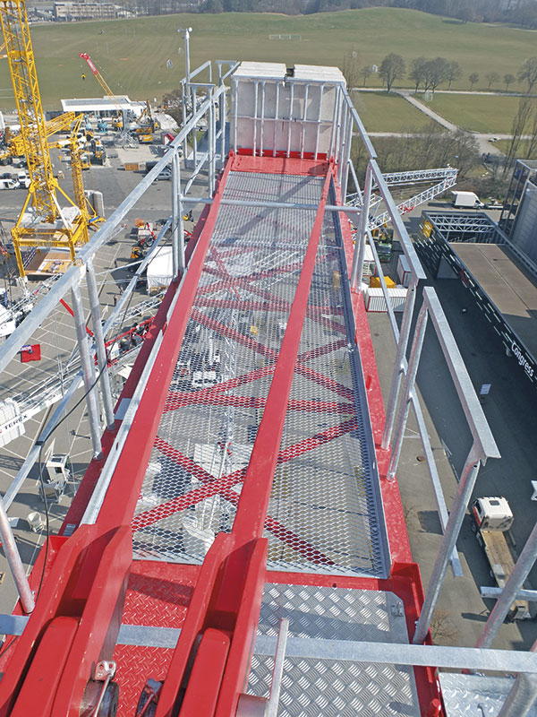 Der Gegenausleger ist mit einer durchgängigen Lauffläche ausgestattet, was den Zugang zu den Gegengewichten komfortabel und sicher macht. Montagehilfen für die Abspannstäbe sowie ein seitliches Podest im Bereich der Gegengewichte ermöglichen eine einfache und sichere Montage. Die Gegengewichte haben alle eine einheitliche Größe von 1,8 t pro Stein, wodurch kein Spielraum für Verwechslung und fehlerhaften Aufbau besteht.