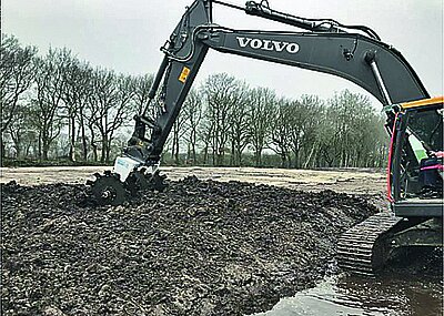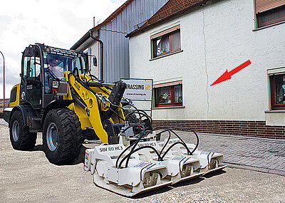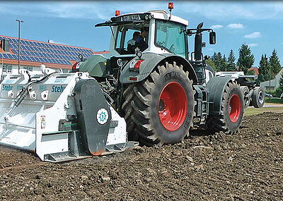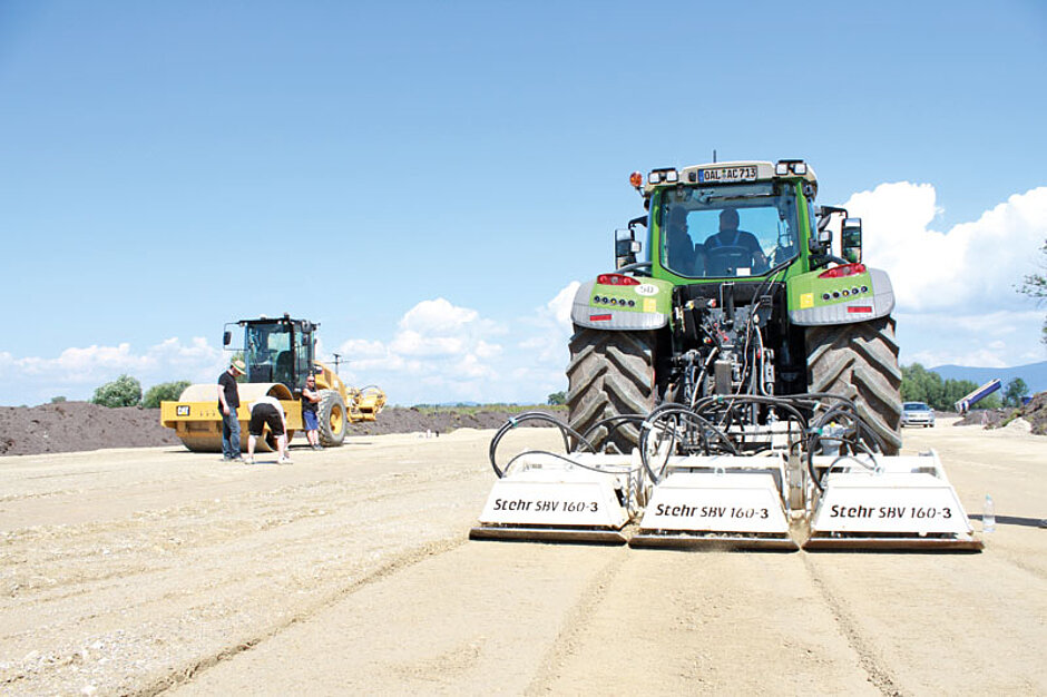 Da zum Verdichten oft ein optimaler Wassergehalt nicht vorhanden ist, muss vor dem Verdichten bewässert werden. Hierzu wird bei Amand bis jetzt ein separates Fahrzeug vorgehalten. Das Schwalmtaler Unternehmen Stehr hat auch hier eine Lösung geschaffen und baut an die Frontseite des Fendt 724 Vario Schleppers einen 3 000 l fassenden Wasserbehälter. Über eine gesteuerte Sprühanlage kann das Wasser genau dosiert aufgebracht werden. Bei einer Verdichtungsfrequenz von 70 Hz des an den Fendt ebenso angebauten neuen Stehr-Plattenverdichters SBV 160-3 mit einer Wuchtkraft von 3 x 160 kN und 3 m Arbeitsbreite werden Verdichtungsergebnisse und Leistungen erreicht, die – so berichtet das Unternehmen Stehr – mit keinem anderen Verdichtungsgerät zu erreichen seien.