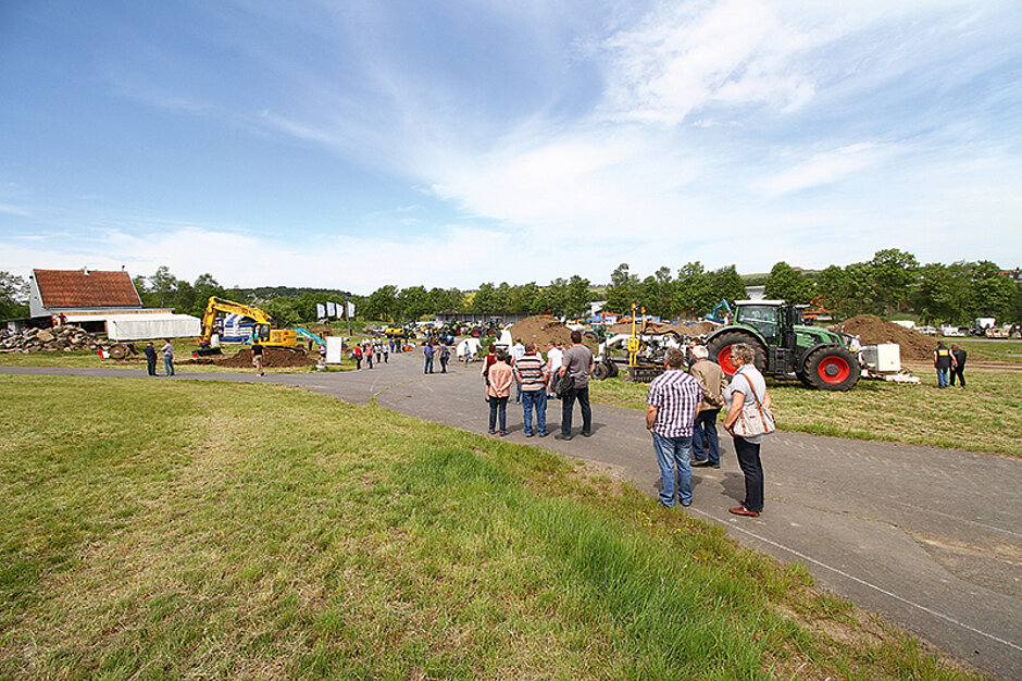 Neben Bekanntem und Bewährtem gab es einige Highlights, die das erste Mal öffentlich gezeigt wurden: So waren beispielsweise der neue Kramer-Elektroradlader mit Stehr-Plattenverdichter oder Kramer- und Wacker-Neuson-Radlader mit Hochleistungshydraulik zu sehen. Vorgestellt wurde auch das neue Bodenstabilisierungssystem 24-3 – speziell für kleine Baustellen – mit dem Bindemittel staubfrei in den Boden gemischt wird, wie auch neu konzipierte Bindemittelstreuer mit einem Volumen von 8 m³ und 14 m³. Das Besondere an ihnen ist die rahmenlose Konstruktion des Behälters, den man einfach auf einen Anhänger oder eine Kipperpritsche legt. Dabei wird zum Transport eines Tiefladers die Pritsche hinten hochgekippt, das Zugmaul wird frei und der Tieflader mit Schlepper und Fräse kann angehängt werden. Als »Hingucker« erwies sich auch der Fendt 1050 mit der stärksten Stehr-Bodenstabilisierungsfräse des Typs SBF 24/2 im Einsatz. Auch auf dem Verdichtungsparcours war der Andrang groß. Hier zeigten die neuen Stehr-Plattenverdichter in Breiten bis zu 4 500 mm in sämtlichen Variationen ihre Vorzüge gegenüber einem fast neuen Walzenzug. Die Verdichtungswerte konnten von den sachkundigen Besuchern selbst gemessen werden. Dass dies fast ohne Schwingungen in der Umgebung möglich ist, wurde mit dem Wasserglastest – auch eine Erfindung von Jürgen Stehr – bewiesen.