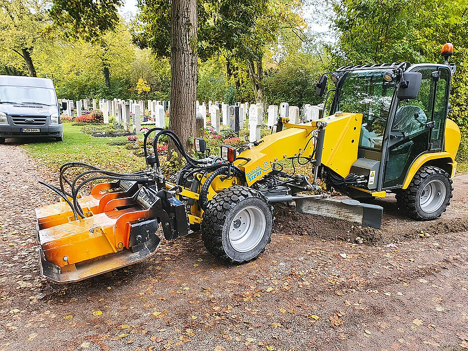 Ausgestattet mit einem modernen Maschinen- und Fuhrpark werden von Seizmeir auch »spezielle« Bauvorhaben flexibel und präzise nach Kundenwunsch durchgeführt. So auch die Neugestaltung von Friedhofswegen auf dem 7,58 ha großen, mehr als 500 Jahre alten Parkfriedhof in München-Untermenzing. Hier kam der Stehr-Minigrader SUG 20 mit Plattenverdichter zum Einsatz, um die lediglich rund 2,2 m breiten Kieswege neu zu gestalten.