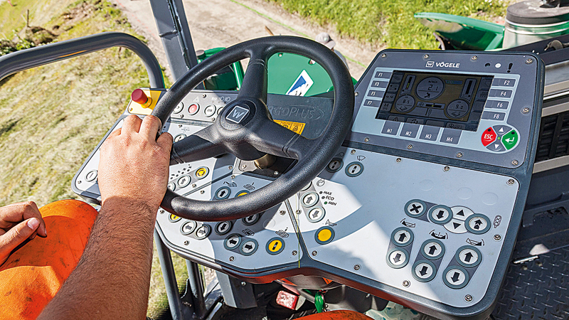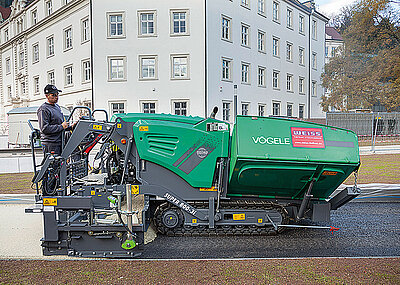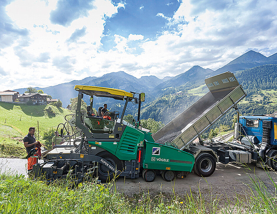 In Castiel beeindruckte der Super 1803-3i vor allem durch seine hohe Traktion und Wendigkeit. »Dadurch ist die Arbeit bei extremem Gefälle fast so einfach wie im Flachland«, sagte Fertigerfahrer Oliveira Rodrigues Hugo. Mit dem leistungsstarken Antriebs- und Materialförderkonzept war es für die HEW-Einbaumannschaft ein Leichtes, die Baumaßnahme in einer Arbeitsschicht abzuwickeln. Dazu trug auch die kurze Rüstzeit des Fertigers bei. So können Vögele-Nivelliersensoren per Plug & Play angeschlossen werden: Die Vögele-Nivellierautomatik Niveltronic Plus erkennt den angeschlossenen Sensor automatisch. Per Schnelljustage-Funktion definiert der Bohlenbediener anschließend einfach die Sollwerte – und die Arbeit kann beginnen. Auch nach getaner Arbeit geht es schnell: Der Super 1803-3i ist mit bis zu 20 km/h auf eigener Achse unterwegs. §