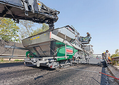 Die Baumaßnahme in knapp 1 200 m Höhe wies ein extremes Gefälle von bis zu 11 % auf. Zudem ist der Wirtschaftsweg lediglich für Fahrzeuge bis 18 t ausgelegt. Bedingungen, wie geschaffen für den Radfertiger der »Strich 3«-Generation von Vögele.