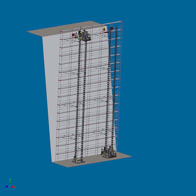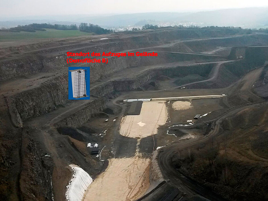 Die Macher der Steinexpo sind seit jeher erfinderisch, wenn es um das Setzen besonderer Highlights geht. So war die Idee, eine Bruchwand im Steinbruch Nieder-Ofleiden während der Messe mit einem wie auch immer gearteten Aufzug zu überwinden, bereits für die Steinexpo 1996 gedanklich im Spiel. Umsetzbar war sie damals aus unterschiedlichen Gründen nicht, nun aber wird aus dem früheren Gedankenmodell tatsächlich Wirklichkeit. Erstmals wird zur Steinexpo 2014 ein 30 m hoher Personenaufzug zwei Sohlen des Basaltsteinbruchs in Nieder-Ofleiden miteinander verbinden. Pro Fahrt können jeweils sieben Personen 25 Sekunden lang einen einzigartigen Rundblick über weite Teile des Messegeländes genießen.Für die Errichtung der Aufzuganlage inklusive Peripherie erteilte die zuständige Bergbehörde eine Sondergenehmigung. Die eigentliche Installation übernimmt das Kompetenz-Center Aufzüge von Zeppelin Rental. Die Fachleute stellen sich damit einer anspruchsvollen Aufgabe: Da die Wand nicht komplett senkrecht steht, sondern eine steinbruchtypische Neigung aufweist, ist zuerst ein aufwändiger Spezialgerüstbau erforderlich. Der Übergang vom Aufzug zur oberen Steinbruchebene stellt eine weitere Herausforderung dar. Eine stabile Verankerung der Gesamteinheit in der Steinbruchwand sorgt für die notwendige Sicherheit. Der Steilaufzug dürfte im Messe-Steinbruch kaum zu übersehen ist. Dafür ist nicht nur seine Größe verantwortlich, sondern auch die Tatsache, dass sich das dafür errichtete Gerüst – wie der Messeveranstalter Geoplan unterstreicht – als Werbeträger für Aussteller geradezu empfiehlt.