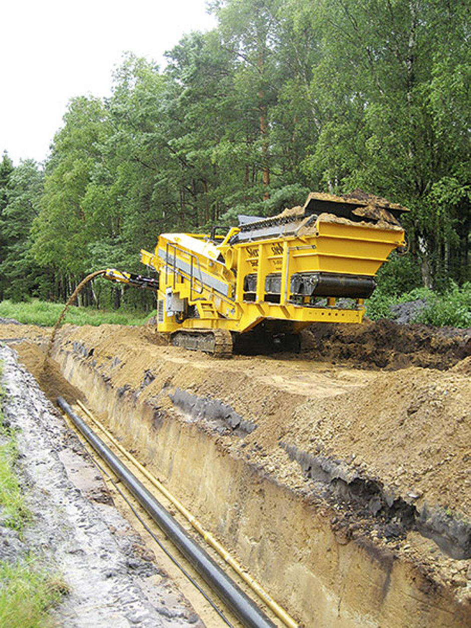 Das Sternsieb 2-ta, der sogenannte Pipeline Padder, siebt als raupenmobile Siebmaschine in zwei Fraktionen ab. Der Austrag des feinen Materials – das im Anschluss wieder auf und um das Rohr verfüllt wird – erfolgt seitlich, was es ermöglicht, den Pipeline Padder am Schachtrand entlang zu verfahren. Außerdem kann der Pipeline Padder auch in hügeligem Gelände mit bis zu 10° arbeiten. Der Durchsatz der Anlage ist abhängig von Material, gewünschter Körnung, Grobkornanteil oder auch Arbeitsbedingungen. Bei einer Körnung von 20 mm liegt der Durchsatz bei bis zu 200 t/h, bei 15 mm bei bis zu 150 t/h. Neben dem Rohrleitungsbau kann das Sternsieb 2-ta für steinige Lehm- und Tonböden sowie für Bauschutt oder organische Anwendungsfälle wie Kompost und Hackschnitzel eingesetzt werden. Mit einem neuen Premium-Sternsieb wird es auch zum Reinigen von Bio-Zuckerrüben eingesetzt.