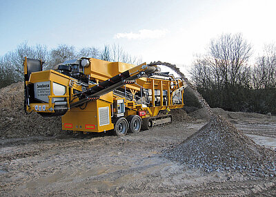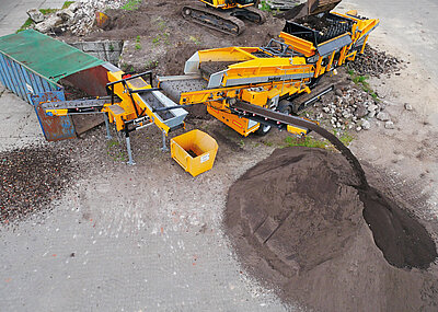 Mit der elektrohydraulischen Sternsiebmaschine »2-cp« auf einer 20-Fuß-Wechselpritsche stellt der Hersteller außerdem eine platzsparende und flexible Lösung vor. Die kompakte Einheit kann bequem mit einem Rad- oder Teleskoplader beschickt werden: Das gesiebte Material wird dabei durch leichte Kurvenfahrten direkt in einer Miete abgelegt. Alternativ lässt sich die Maschine auf einer Achse montieren und flexibel rangieren. Soll eine besonders feine Absiebung erreicht werden, kann ein entsprechendes Siebdeck nachgeschaltet werden. Der energieeffiziente Antrieb, wahlweise elektrisch oder elektrohydraulisch, sorgt für geringen Energieverbrauch bei gleichzeitig hoher Leistungsfähigkeit – ideal also für kleinere Projekte, temporäre Einsätze oder enge Platzverhältnisse auf der Baustelle.