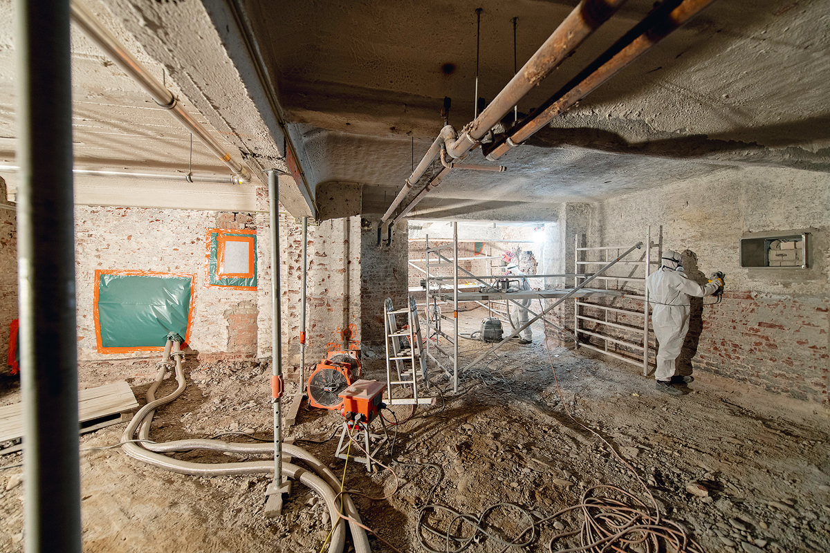 Die große Herausforderung war es, die im Jahr 1848 entstandenen Keller- und Tunnelbereiche auf Rohbau-Niveau zu sanieren. Einher ging das mit einer vollständigen Entkernung, einer Desinfektion und Reinigung aller Bereiche sowie aufwendigen Schadstoffuntersuchungen und der Wiederherstellung des Rohbauzustands aller betroffenen Flächen an Wänden, Decken und Böden. Viel Arbeit, für die ein hohes Maß an Expertise benötigt wird.