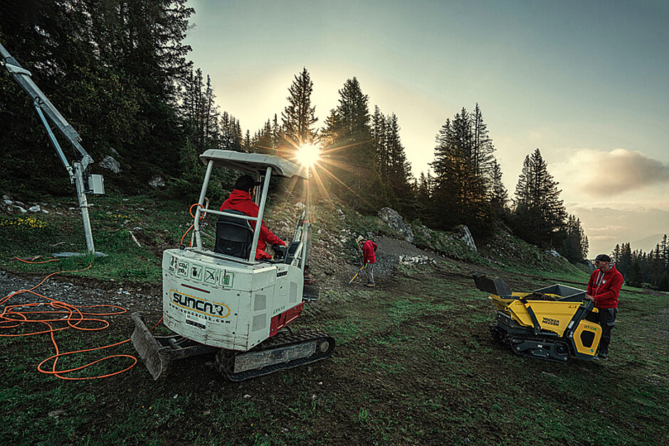 In Tourismusregionen setzt man immer mehr auf Nachhaltigkeit, viele Urlauber buchen bewusst entsprechende Ferien. Seit Jahren sind deswegen in autofreien Bergregionen, wie beispielsweise in Saas-Fee, leise und abgasfreie Elektrobagger gern gesehen. Neu werden die Bagger auch abseits von Siedlungen und Straßen eingesetzt, die einzige Voraussetzung ist ein genügend starker Stromanschluss in der Nähe.