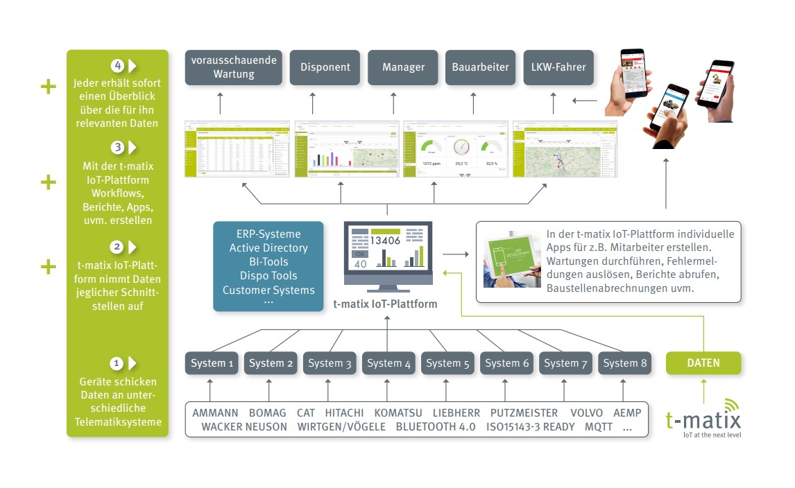 Bauunternehmen stehen vor der Herausforderung, die Verfügbarkeit Ihres Fuhrparks sowie der Maschinen perfekt zu planen und effizient einzusetzen. Für die Planbarkeit wird eine aussagekräftige Datengrundlage benötigt, die durch den heterogenen Fuhr- und Maschinenpark mit unterschiedlichen Herstellern zu einer großen Hürde für Unternehmen wird. Darüber hinaus ist ein Soll-Ist-Vergleich der Daten in einem externen ERP-System, einem Planungstool essenziell, um die Disposition effizient und kostenoptimiert zu gestalten. Was es braucht ist eine IoT-Plattform, die flexibel und herstellerunabhängig ist, externe Systeme integriert und aussagekräftige Berichte liefert. Die t-matix Construction Solution deckt genau diesen Bedarf an IoT-Lösungen am Markt ab.