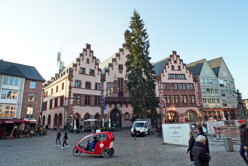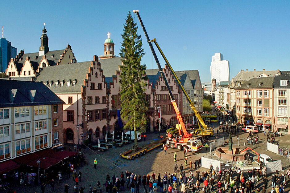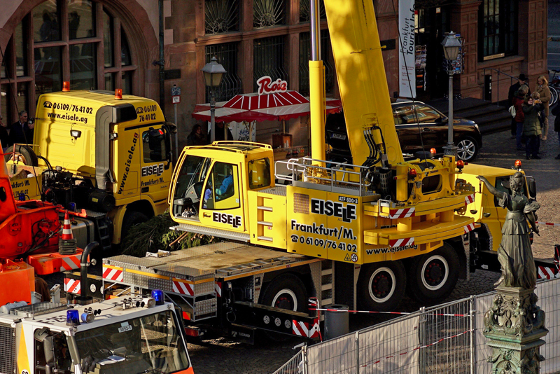 Eine der Touristenmagneten der Bankenmetropole. Und einmal im Jahr Ort eines besonderen Spektakels. Für die einen, die Schaulustigen, ist das traditionelle Aufstellen des Weihnachtsbaums reines Vergnügen. Abgerundet durch Blasmusik und Würstchen. Für die anderen, alle direkt für den Baum Verantwortlichen, ist es eine schöne, zugleich herausfordernde Aufgabe. So auch für die Eisele AG, die mit ihrem ATF 60G-3 maßgeblich zu einem bruchfreien Aus- und Einheben des Baums beitrug.
