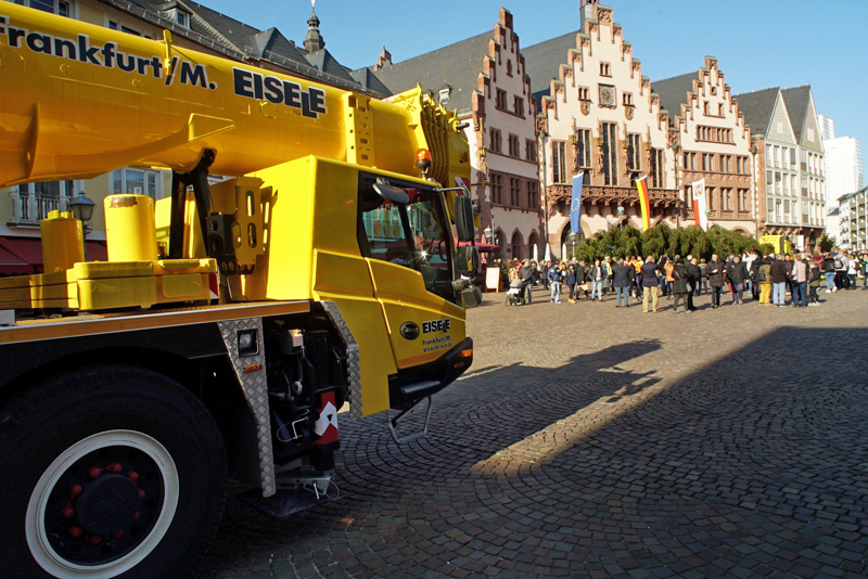 Europaweit bietet Eisele seinen Kunden, Firmen aus den verschiedensten Branchen, das komplette Paket für alle Services rund um Krane, Transporte, Betriebsumzüge und Industriemontagen. Baumaufstellen gehört natürlich nicht zum Tagesgeschäft des Maintaler Unternehmens – auch wenn es nach 2018 bereits der 2. Einsatz auf dem Römer war. Für den ATF 60G-3 jedoch war es eine Premiere: Der All-Terrain von TADANO ist sozusagen ein Frischling in der Kranflotte. Eisele verfügt, inkl. des ATF 60G-3, bereits über 7 TADANO Krane. Der erste Kran aus Lauf an der Pegnitz ging schon 1990 nach Maintal. Seitdem punktet man bei Eisele durch die typische überdurchschnittliche Leistungsfähigkeit und die besondere Zuverlässigkeit. Dies zeigt sich u. a. darin, dass Eisele seine Flotte ausbaut und ältere TADANO Krane, die besonders leistungsfähig sind, auf aktuelle Erfordernisse hin anpasst.