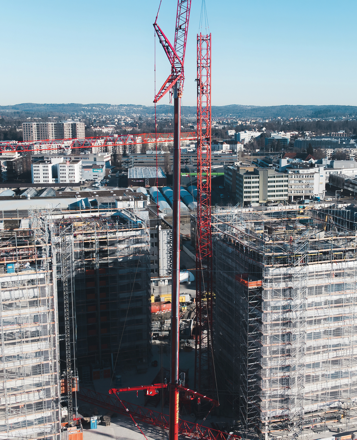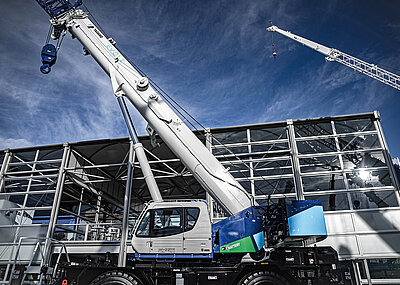 Für die Aufstockung der insgesamt drei Baukrane rüstete das Egger-Team den AC 7.450-1 in SSL-Konfiguration mit 57,3 m langem Hauptausleger plus einer um 60° abgespannten 42-m-Wippe und 70 t Gegengewicht. Damit erreichte der Kran die erforderliche Hubhöhe von 100 m, um die bis zu 19 t schweren Komponenten der Baukrane zu heben. Für die Schweizer stellt der »Seitliche Superlift« SSL eine der entscheidenden Weiterentwicklungen des AC 7.450-1 dar: Die Superlift-Arme sind bei dem neuen Konzept ganz vorn am Kopf angebaut, sodass sie deutlich länger ausfallen und damit für höhere Traglasten gut sind.