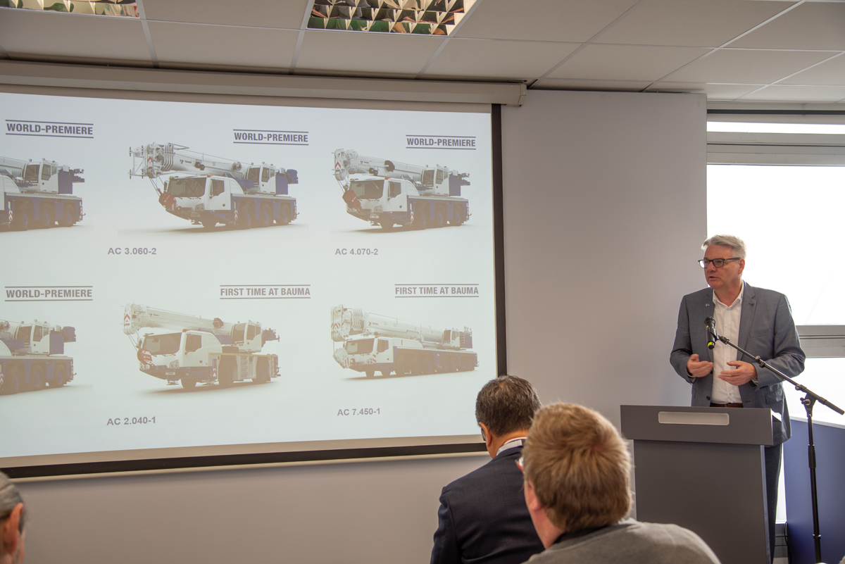 Die meisten Krane am Tadano-Stand waren neue Serienmodelle, die seit der Bauma 2019 eingeführt wurden. Zu den 22 neuen Modellen der vergangenen dreieinhalb Jahre gehören fünf All-Terrain-Krane der AC-Serie, zwei HK-Lkw-Aufbaukrane, zwei GTC-Teleskop-Raupenkrane, elf Rough-Terrain-Krane der GR-Serie und zwei Lkw-Aufbaukrane aus der TM-Baureihe.
