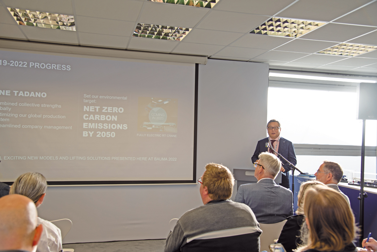 »Die Tadano-Gruppe hat das Ziel ausgegeben, bis 2050 Netto-Null-Emissionen zu erreichen«, so CEO Toshiaki Ujiie. Auf der Bauma hat das Unternehmen sein Hybridmotorenkonzept zur Senkung der CO₂-Emissionen und sein elektrohydraulisches E-Pack-System für den emissionsfreien Kranbetrieb vorgestellt, das bereits mit dem »ESTA Award of Excellence« ausgezeichnet wurde. »Damit nicht genug, werden wir 2023 unseren vollelektrischen Rough-Terrain-Kran mit emissionsfreier Technologie vorstellen«, so Ujiie. t