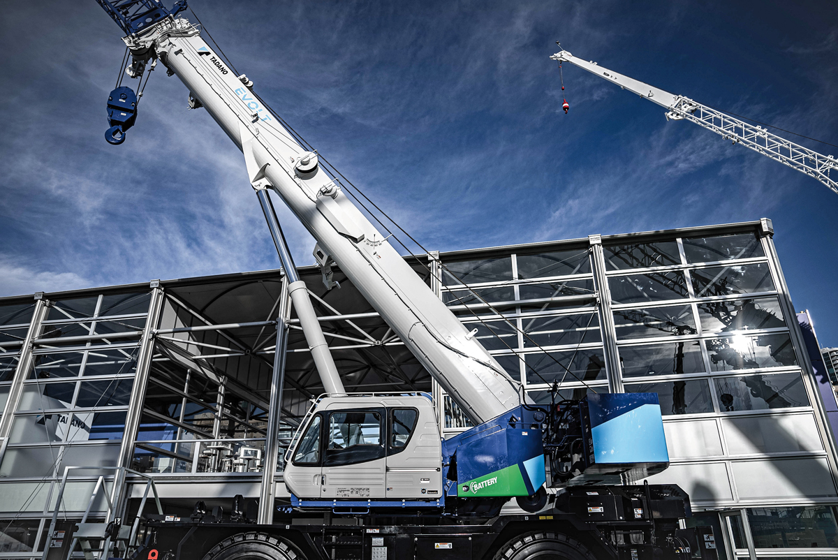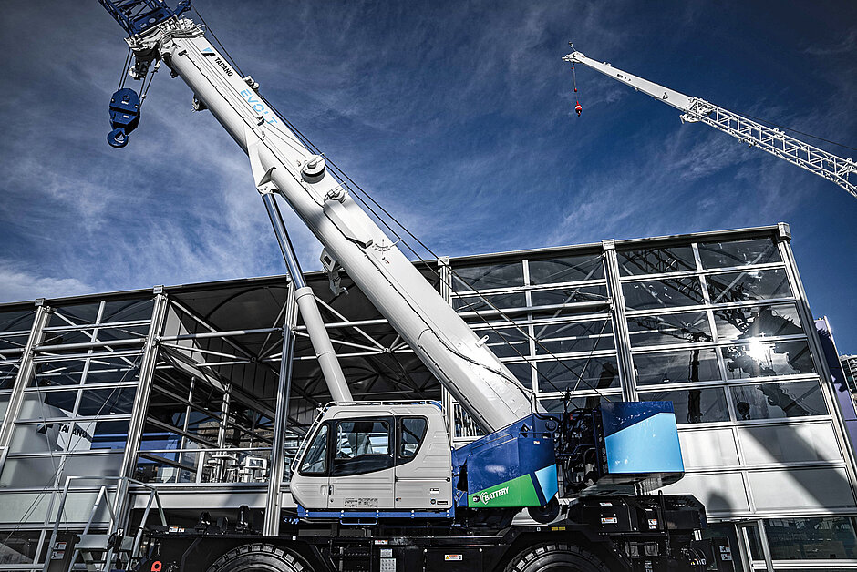 Für den japanischen Markt ist der ebenfalls vollelektrisch betriebene Rough-Terrain-Kran GR-250N Evolt vorgesehen. Seine Einführung ist für die zweite Jahreshälfte 2023 geplant. Der GR-250N EVOLT ist ein 194 kW starker und extrem schneller 25-Tonner, der laut Tadano vor allem bei Fahrten unter schwierigen Straßenbedingungen seine Stärken ausspielen kann. Denn hier erreicht er Spitzengeschwindigkeiten von bis zu 49 km/h, sodass er selbst abgelegene Baustellen sehr schnell erreichen kann. Dort sind mit einer einzigen Batterie-ladung Arbeitseinsätze von bis zu neun Stunden möglich. Das bedeutet in der Praxis beispielsweise, dass der GR-250N Evolt nach einer Fahrtstrecke von 40 km noch für volle fünf Stunden Kranbetrieb ausreichend unter Spannung steht. Nach nur zweieinhalb Stunden Ladedauer an einem CHAdeMO-Anschluss ist er wieder voll einsatzbereit. An einem normalen dreiphasigen AC 200 V / 100 A Anschluss der öffentlichen Stromversorgung beträgt die Ladezeit rund acht Stunden. Prinzipiell unbegrenzte Baustelleneinsätze sind im Plug-in-Betrieb möglich, für die der Kran an eine externe Stromversorgung angeschlossen werden kann. Die Einführung weiterer vollelektrischer Rough-Terrain-Krane für die internationalen Märkte hat Tadano bereits ankündigt.