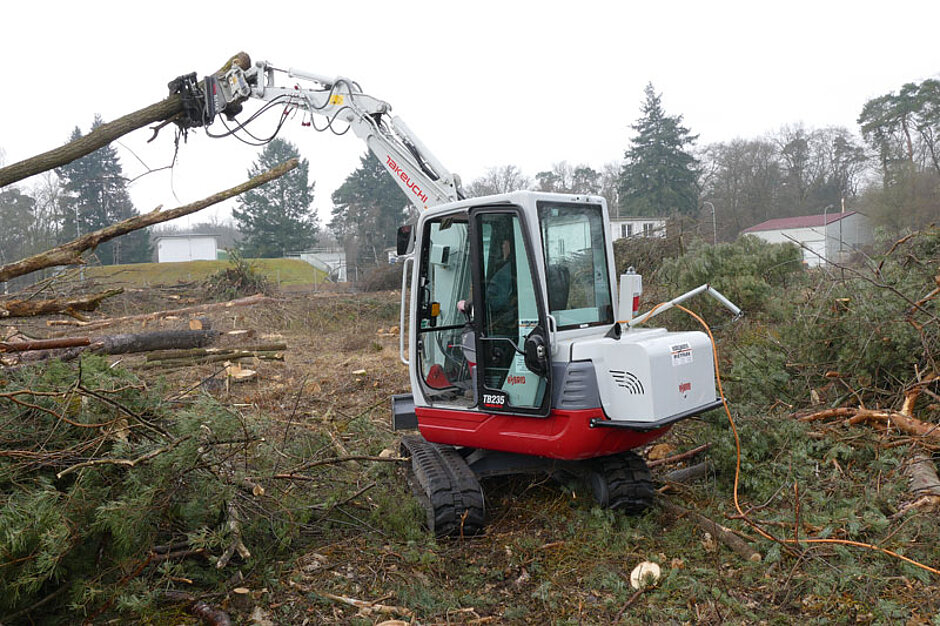 Der 3,8 t schwere Hybridbagger ist mit einem Dieselmotor mit 21,5 kW/28,5 PS ausgerüstet und ebenso mit einem Elektromotor mit 15 kW/20,4 PS. Für diesen Einsatz hier bei Karlsruhe ist er zusätzlich mit einem Rundholzgreifer und einem 360°-Rotator ausgestattet. Standardmäßig verfügt der TB 235 H über einem Schwenkmotor und einen hydraulischen Schnellwechsler. Die vier hydraulischen Zusatzkreisläufe machen das Arbeiten mit dem Hybridbagger einfach und präzise. Auch der Lasthaken mit Rohrbruchsicherung und Überlastwarneinrichtung tragen zum positiven Gesamtbild bei. Die Hauptlagerung am Schwenkbock ist mit gehärteten Stahlbuchsen ausgestattet. Dies garantiert Haltbarkeit und ist spielarm. Der TB 235 H kann viele Meter lange Stämme, Kleinholz oder Buschwerk greifen und bewegen. Dies auf sicherem Stand, den die Laufwerksbreite von 1,63 m bietet. »Wir sind sehr angenehm überrascht, mit welcher Genauigkeit wir den Bagger und seine Anbaugeräte steuern können. Es ist hier bei diesen Rodungsarbeiten oftmals ein sehr genaues Zugreifen notwendig. Das alles ist ohne Probleme und mit absoluter Präzision möglich«, sagt Roland Schulz. Er gründete seine Firma Garten- und Landschaftsbau Roland Schulz im Jahr 1990. Mittlerweile ist die zweite Generation in der Firma aktiv. Mit zurzeit elf Mitarbeitern übernimmt er Baufeldrodungen, Baumarbeiten, Garten-, Teichanlagen u. a. Schulz arbeitet des Öfteren für öffentliche Auftraggeber und er wird immer wieder angefragt, weil er stets die geforderte Qualität abliefert. Hinsichtlich seiner Baumaschinen wird er, und das nicht nur bei diesem Projekt, von der Firma Kohrmann Baumaschinen betreut, die sowohl ein erfahrenes Baumaschinenunternehmen wie auch Takeuchi-Händler ist. Kohrmann ist bereits seit 70 Jahren am Markt und dies mit mittlerweile 14 Standorten in Baden, Sachsen und Sachsen-Anhalt.