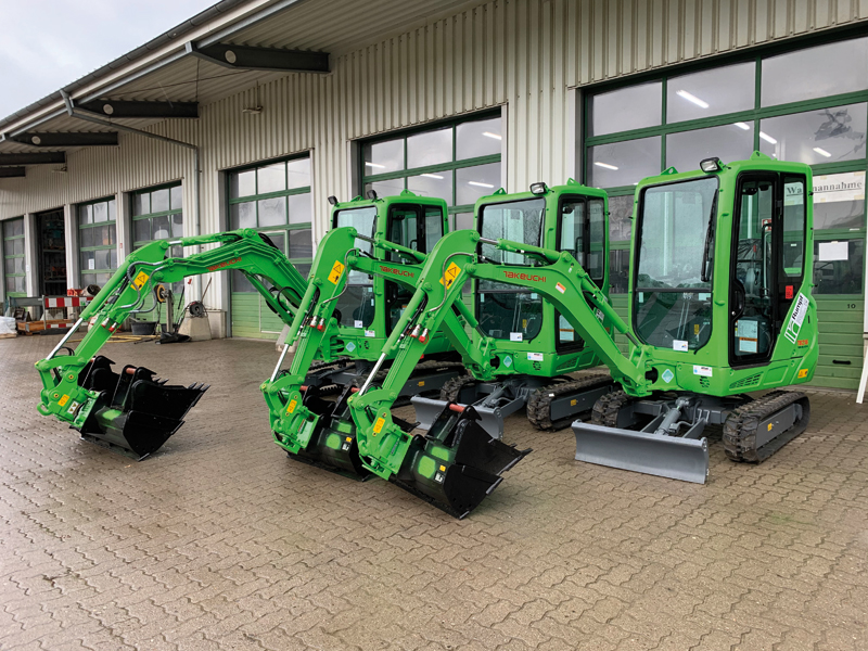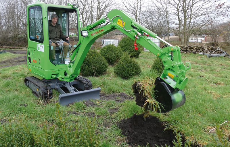Der 2,4 t schwere TB 225 ist mit einem 16,5 kW (22,5 PS) leistenden Motor ausgerüstet. Die Serienausstattung umfasst 28 Positionen, zur Zusatzausstattung hingegen zählen der dritte und vierte hydraulische Zusatzkreis für den hydraulischen Schnellwechsler bzw. die Powertilt-Umschaltung. Auch beim TB 225 ist der Powertilt-Drehmotor um 180° schwenkbar. Ein hydraulischer Lehnhoff-Schnellwechsler des Typs HS 03 ist montiert. Diverse Anbaugeräte gehören zur Sonderausstattung für das GaLaBau-Unternehmen Erwin Rumpf – insbesondere ein Sortiergreifer mit Rotator. Eine Überlastwarneinrichtung und eine Rohrbruchsicherung machen das Arbeiten sicherer.