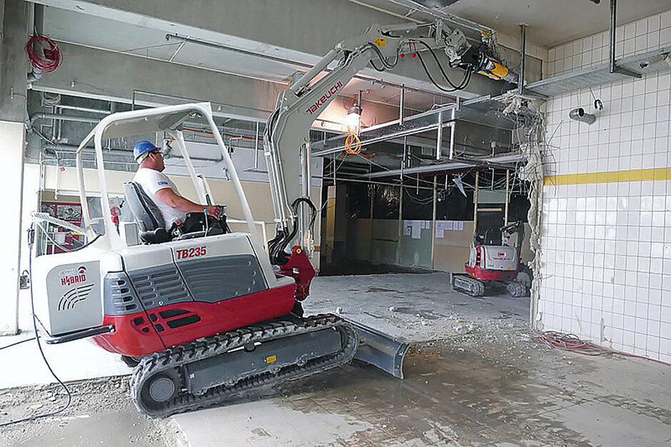 Nur mit dieser absolut präzise arbeitenden Hydraulik ist es möglich, solche, teilweise chirurgischen, Rückbauarbeiten auszuführen«, sagt Marc Bähringer, einer der drei Geschäftsführer der Eternia Bau aus Erfurt. Er arbeitet mit dem Takeuchi-Hybridbagger TB 235 H. Der 3,8-t-Kompaktbagger ist mit einem 21,5 kW (28,5 PS) starken Dieselmotor und einem 15 kW (20,4 PS) leistenden Elektromotor ausgerüstet. Die Umschaltung von Diesel auf Elektro kann während des laufenden Betriebs erfolgen, die Bedienung ist identisch. Die Leistungskraft von Diesel- und Elektroantrieb laut Hersteller ebenfalls.