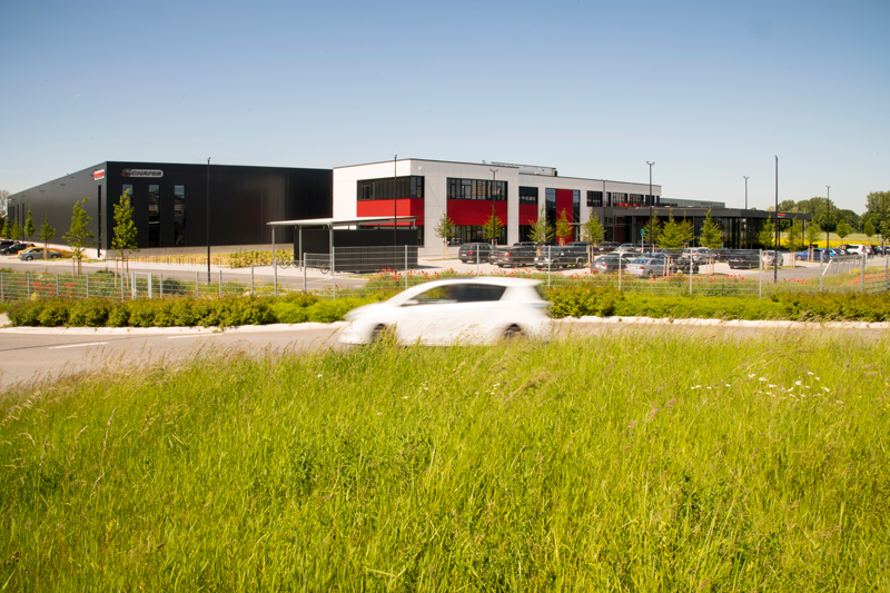 Auf dem rund 44 000 m² großen Komplex inklusive eines Vorführgeländes wurde auf einer Fläche von gut 10 000 m² ein Bürogebäude mit großzügigen und von Maschinen befahrbaren Schulungsräumen und einer Cafeteria errichtet, zudem eine Montagehalle samt Waschstraße sowie ein Hochregallager und ein überdachter Versandbereich. Alles ist energetisch auf dem neuesten Stand: Sensoren steuern das Raumklima, es gibt eine Photovoltaikanlage, das Regenwasser wird aufbereitet, das Dach ist begrünt.