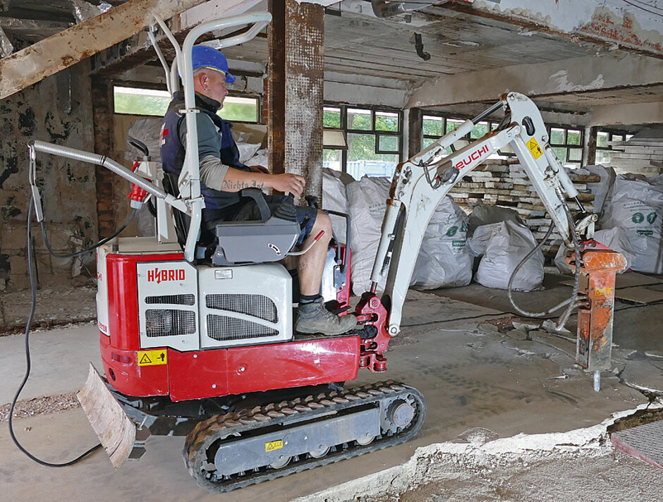 Der TB 210 RH kann mit Hydraulikhammer, je nach Fabrikat, bis zu 3,2 m hoch arbeiten. In Weimar mussten 4 800 m² Wand und 4 200 m² Boden ausgebaut werden. Hier war Leistung gefragt und die lieferte der Hybrid-Bagger. »Wir mussten durch den Elektroantrieb keine Pausen, wie es beim Batteriebetrieb der Fall ist, einlegen. Das hat uns sehr geholfen«, sagt UTL-Geschäftsführer Uli Zeunemann. Man kann den TB 210 RH auch im Mehrschichtbetrieb arbeiten lassen. Benötigt wird dazu ein 380-V-Anschluss und schon läuft der Bagger ohne Dieselemissionen.