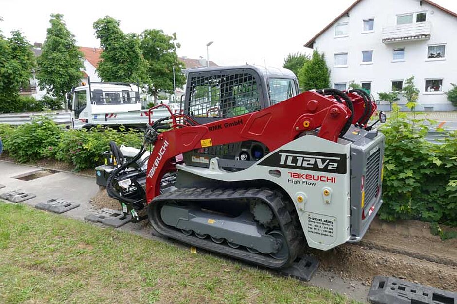 Angetrieben vom 78,2 kW (106,3 PS) starken Motor mit 3,7 l Hubraum gräbt sich die vorne an der Takeuchi-Laderaupe TL 12 V2 montierte Fräse in den Fußweg. Ein 10 cm breiter und etwa 40 cm tiefer Rohrgraben entsteht so innerhalb kurzer Zeit. Er wird für die Verlegung von Speednet-Rohren für das schnelle Internet genutzt. Auf die Idee, mit dieser Technik zügiger Breitbandkabelrohre verlegen zu können, kam Gerald Vatter, Geschäftsführer der Rhein-Main-Kabelgesellschaft aus Alzey. Die Idee wurde technisch umgesetzt vom Takeuchi-Generalimporteur Wilhelm Schäfer aus Mannheim. Und so fand der erste Einsatz nun in Wörth nahe Karlsruhe statt.