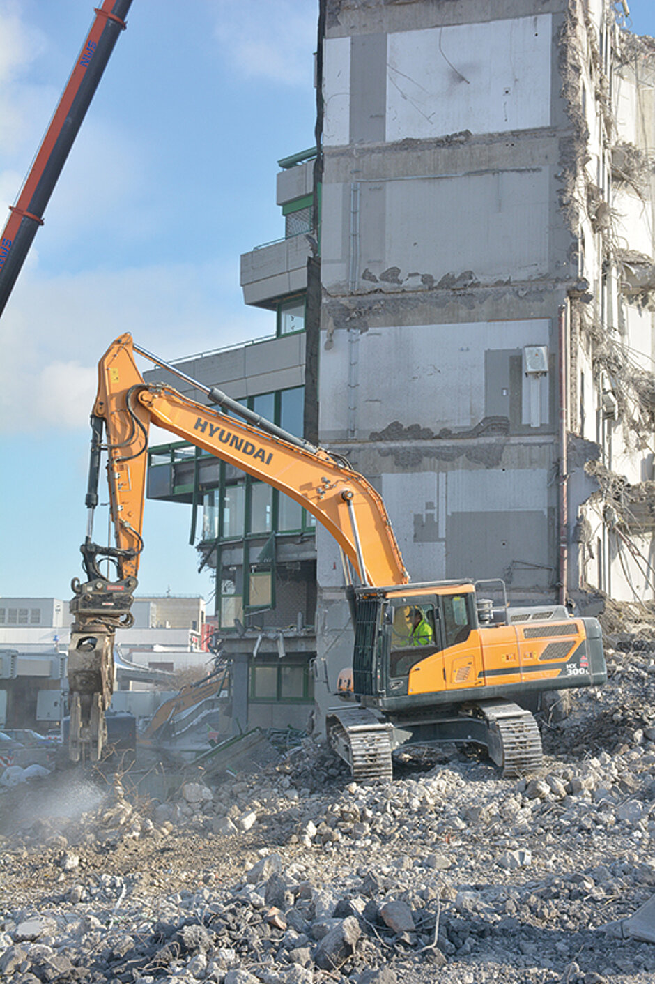 Bitzer lässt die bestehenden Gebäude abreißen und einen neuen Komplex auf dem Gelände errichten. Doch vor dem Neubau sind bestehende Bürogebäude abzureißen. Der drei Monate alte Hyundai-Kettenbagger HX300 L ist zum Sortieren und Trennen von armierten Betonteilen eingesetzt. Mit einem 3 500 kg schweren Pulverisierer trennt er Beton von der Armierung und verlädt diese in Mulden und Lkw.