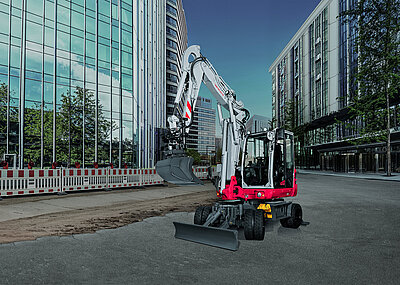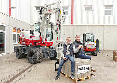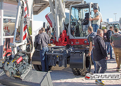 Das Fahrwerk kann von 980 mm auf 1 370 mm verbreitert werden. Diese Flexibilität macht es möglich, auch in zugewachsenen Gärten oder bei schmalen Durchfahrten mit dem »TB 320« zu arbeiten – und das auf einem standfesten sowie sicheren Fahrwerk. Mit 77,6 dB(A) gilt er laut Schäfer als leiser Helfer, und mit einer Fahrgeschwindigkeit von 4,5 km/h ist die Maschine gleichzeitig solide unterwegs. Steigungen bis 15° meistert er ohne Probleme. Auch mit Anbaugeräten kann der schmale Takeuchi auf einem Anhänger bis 3,5 t transportiert werden. Ein weiterer Vorteil ist, dass der Maschinentyp mit einem Kran verhoben werden kann, die Ösen am Dach halten den »320er« dabei in der Waage.