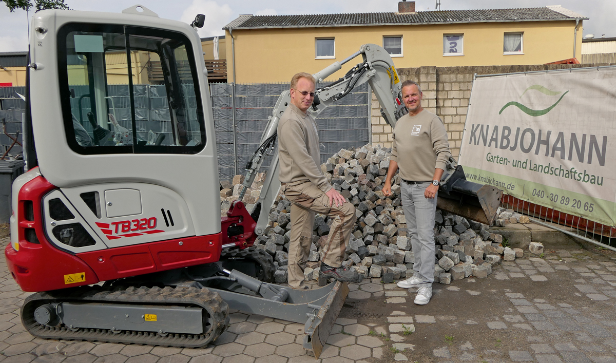 Einem Garten zu neuem Glanz verhelfen, ist das Hauptarbeitsfeld der Firma Knabjohann Galabau aus Hamburg. Dabei hilft nun ein 2 t schwerer Takeuchi-Bagger des Typs »TB 320«. Die maximale Reichweite liegt bei 4 090 mm, während die Grabtiefe mit rund 2 370 mm beziffert wird – ausreichend Arbeitsspielraum also, um Teiche, Fundamente oder Zuwegungen realisieren zu können. Mit 12 kW Leistung hat der Zweitonner auch genügend Kraft, um fest zu greifen oder zu heben. Die vier hydraulischen Zusatzkreisläufe können z. B. für Sortiergreifer, Hydraulikhammer oder Verdichterplatte genutzt werden. Mit dem hydraulischen Schnellwechsler und dem Hydraulik-Kupplungssystem »Taklock« ist ein Gerätewechsel in Sekunden möglich. Auch dann, wenn das Anbaugerät unter Druck steht. »Unser Hauptarbeitsgebiet ist der Hamburger Westen. In erster Linie arbeiten wir in Privatgärten. Sozusagen alte Gärten mit neuen Ideen anlegen. Dafür brauchen wir einen flexiblen und robusten kleinen Bagger. Der ›TB 320‹ passt genau«, sagt Oliver Knabjohann, Geschäftsführer von Knabjohann Gartenbau.