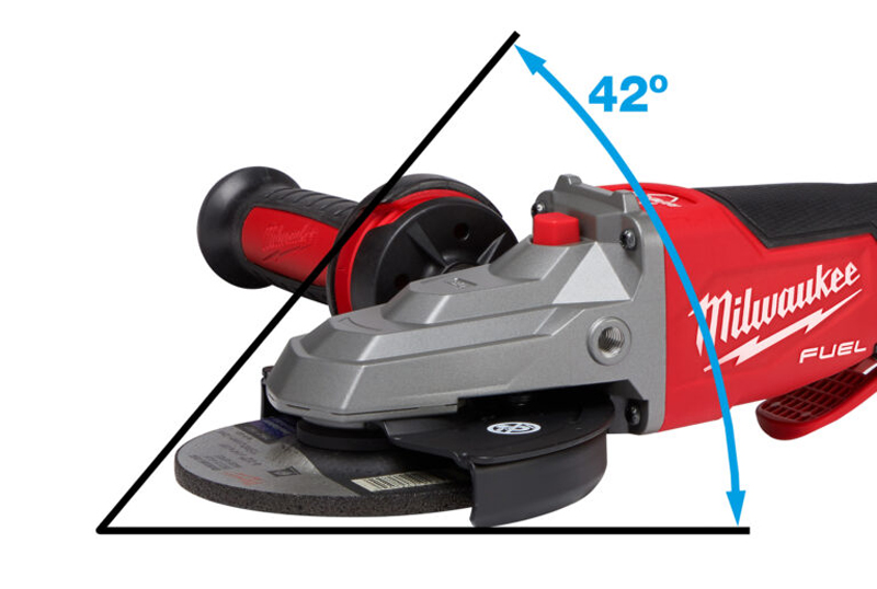 Der Akku-Winkelschleifer M18FSAGF125 besitzt einen deutlich fla-cheren Kopf als die anderen Geräte. Er bietet Vorteile im Handling bei wenig Platz. Die Arbeit ist auch in engen Winkeln möglich.