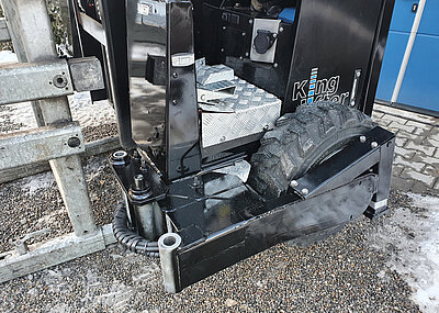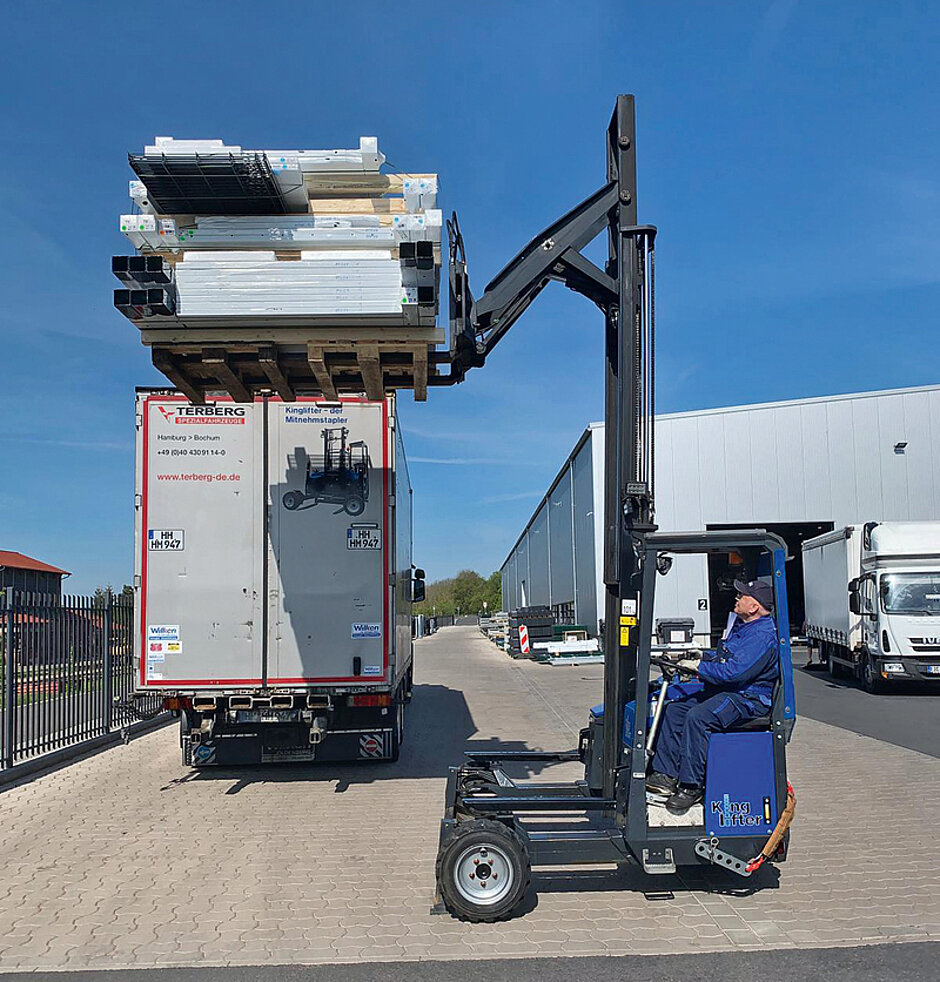 Der KingLifter M ist das größte sowie »universellste« Modell der Flotte und wartet mit der größten Optionsvielfalt auf. Der verbreiterte Radstand sorgt für erhöhte Fahrstabilität mit und ohne Beladung. Sein nochmals erweiterter Seitenschub macht ihn besonders flexibel beim Verladen. Wie das Modell S, ist auch das Modell M mit Einrad- und Allradantrieb erhältlich. Weitere Merkmale sind die 4-Wege-Steuerung oder auch ein Terberg-Duplex-Rollenmast mit einer Hubkapazität von bis zu 2 500 kg und einer Hubhöhe von bis zu 4 050 mm.