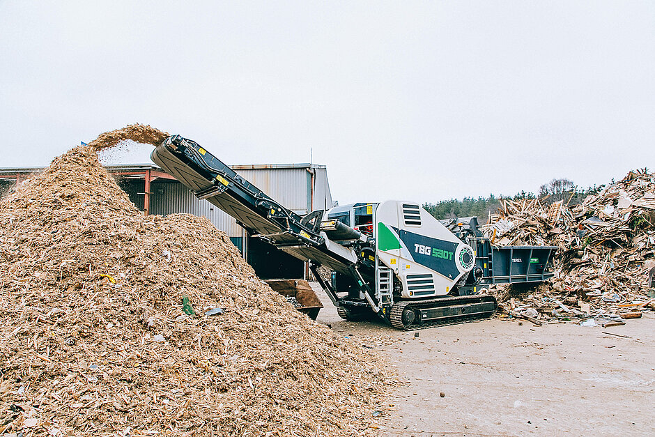 Der TBG 530T ist binnen weniger Minuten einsatzbereit, beschickt wird er über eine Zuführung von hinten. Sein intelligentes Vorschubsystem besteht aus hochbelastbaren Schleppketten und einem aggressiven Vorschubrad mit Hebe-/Absenkhilfe. Das Herzstück der Anlage ist der 1 100 mm durchmessende und 1.490 mm breite direkt angetriebene Pendelhammerrotor, seine Umdrehungszahl liegt bei 1 000 min‐¹, er verfügt über 30 aufwärts schwingende Hämmer. Eine breite Hammer-Design-Auswahl und austauschbare Siebe erlauben die Anlagenanpassung an veränderte Produktanforderungen. Der TBG 530T verfügt auch über ein Siebrückschlagsystem – sollte ein nicht zu zerkleinernder Gegenstand in die Kammer eindringen, löst sich das Sieb und lässt das Material passieren.