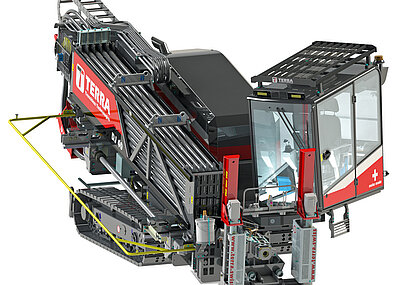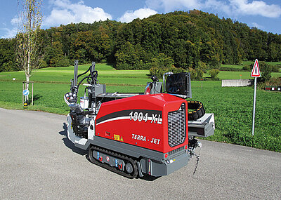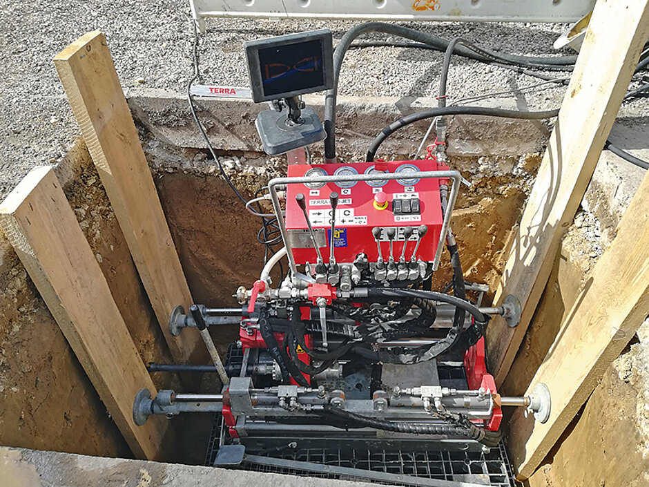 Nachdem Start- und Zielgrube erstellt waren, konnte mit der Baustelleninstallation begonnen werden. Die Terra-Mini-Jet wurde hydraulisch an das Aggregat angeschlossen und das Bentonit in der Mischstation angemischt. Angesetzt wurde der Bohrkopf für die Pilotbohrung in der Startgrube auf 1,1 m bei einem Neigungswinkel von – 2 %. Dank entsprechender Kalkulation konnte auch der Kanal mit nötigem Sicherheitsabstand gekreuzt werden. Die Pilotbohrung für die 45 m lange Strecke war bereits nach zwei Stunden beendet. Angekommen in der Zielgrube wurde alles für den Rohreinzug vorbereitet: So wurden der Terra-Räumer und -Spreizdorn mit dem Produktrohr verbunden. Während des Aufweitvorgangs kamen die besonderen Eigenschaften des MJ 1600 zum Tragen. Dank seiner hohen Drehzahl von 150 min⁻¹ konnte der Räumer gleichmäßig den Boden aufweiten und das Rohr mit einer Zugkraft von 0,8 t belastet werden.