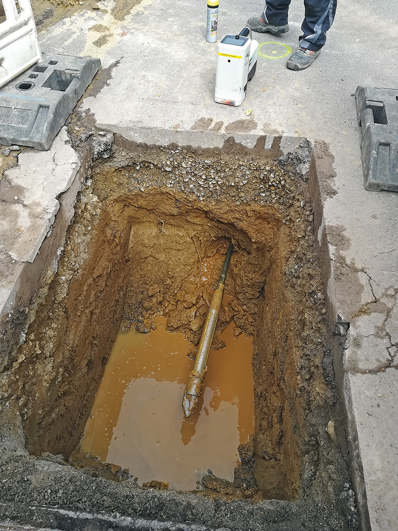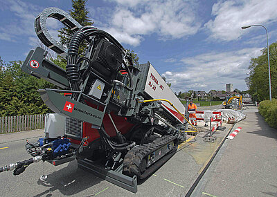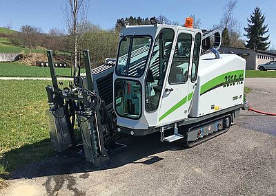 Der Untergrund bestand aus lehmigem, teils kiesigem Boden. Auf dem Bohrpfad musste ein Kanal unterquert werden mit einem Sicherheitsabstand von ca. 0,5 m. Das Gelände war abfallend. Folglich musste ein konstanter Neigungswinkel des Bohrkopfes von –2 % bis 3 % beibehalten werden. Zum Lokalisieren des Bohrkopfs wurde das Ortungssystem Falcon F5 verwendet. Damit konnten auch die Bohrdaten während der Pilotbohrung gespeichert werden.