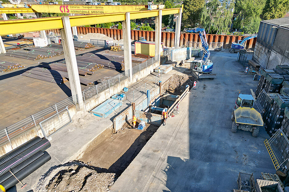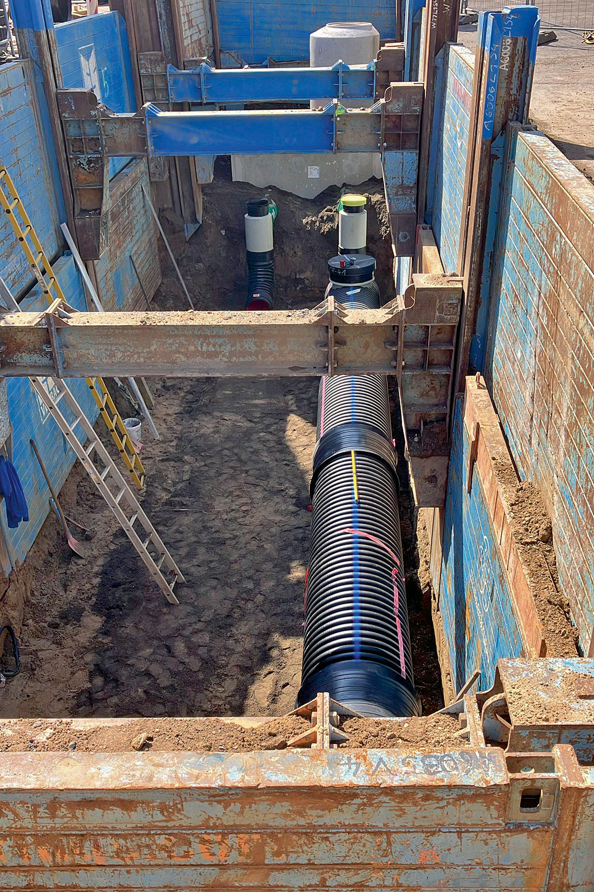 Der gestufte »E+S«-Linearverbau mit U-Laufwagen kam nur an der besonders sensiblen, 4,60 m tiefen Stelle im Bereich des Portalkrans zum Einsatz. Im übrigen Trassenverlauf war die Baugrube lediglich 2,20 m tief, weshalb Verbaukästen für die Sicherung der Baugrube ausreichten. Der 36 m lange Abschnitt entlang der Kranbahn wurde nicht in einem Stück verbaut, sondern in drei Teilabschnitte aufgeteilt, wobei die Sedimentationsrohre entsprechend dem Baufortschritt sukzessive eingefädelt, auf einem Sandbett abgelegt und fachgerecht verdichtet wurden.