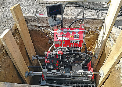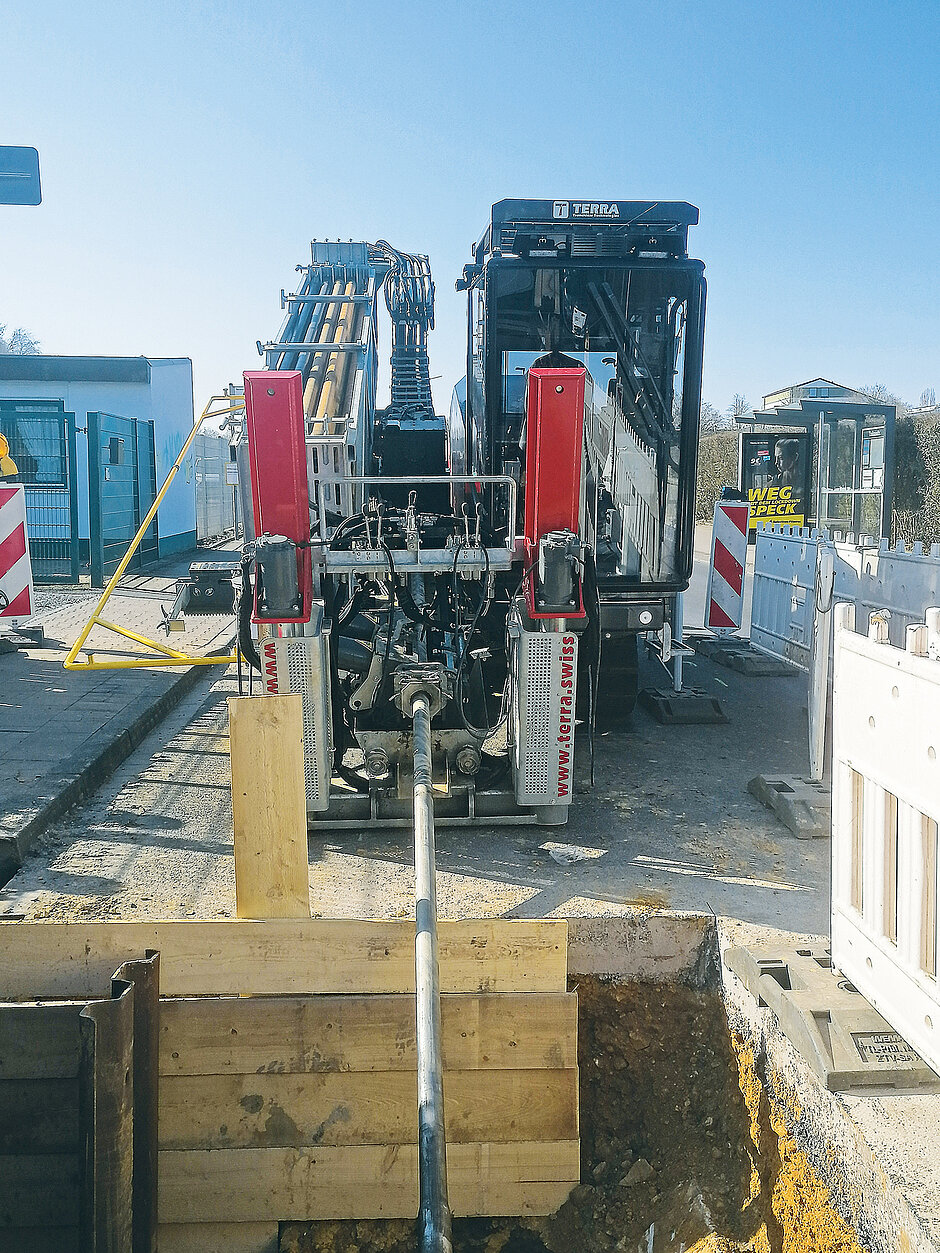 Der Antriebsschlitten dreht mit der Zielsetzung höchster Produktivität bei der Pilotbohrung mit einer maximalen Drehgeschwindigkeit von 255 min–¹. Die Bohrung nahm angesichts des steinigen und kiesigen Untergrunds in Aachen rund einen Tag in Anspruch. Intelligente Bedienelemente wie die Vorschubsteuerung, die Paddelautomatik oder der Bohrtempomat erleichterten den Einsatz.