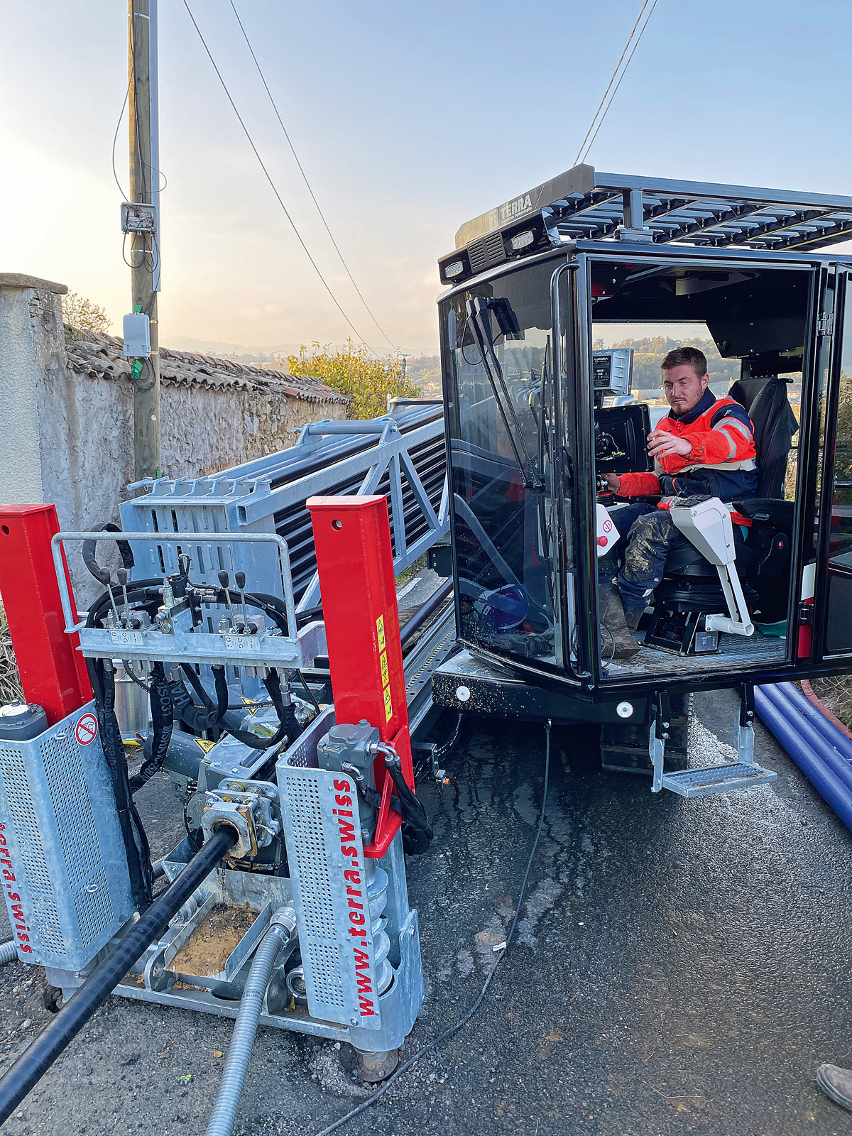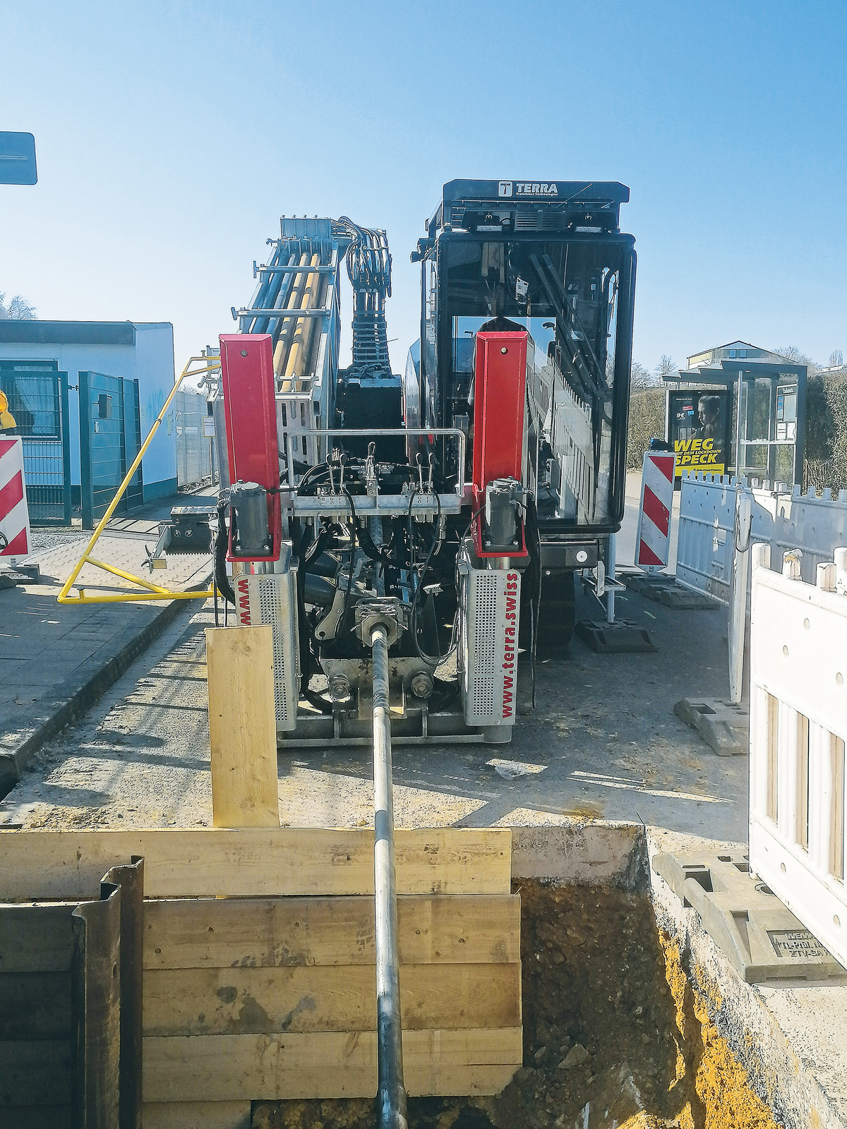 Die anstehende Trasse wurde in insgesamt vier Teilstrecken unterteilt, hier wurden jeweils 2 x 125 mm HDPE-Rohre über eine Bohrlänge à 250 m verlegt. Die Terra-Jet DJ 40 verfügt standardmäßig über 50 Bohrstangen mit einer Länge von 4,57 m an Bord. Mit einem vollen Magazin lassen sich somit 230 m bohren. Dank dem automatischen Nachlademechanismus können weitere Bohrstangen jedoch problemlos seitlich in die Maschine eingelegt werden. Für einen besseren Oberflächenschutz ist das Gestängemagazin feuerverzinkt.
