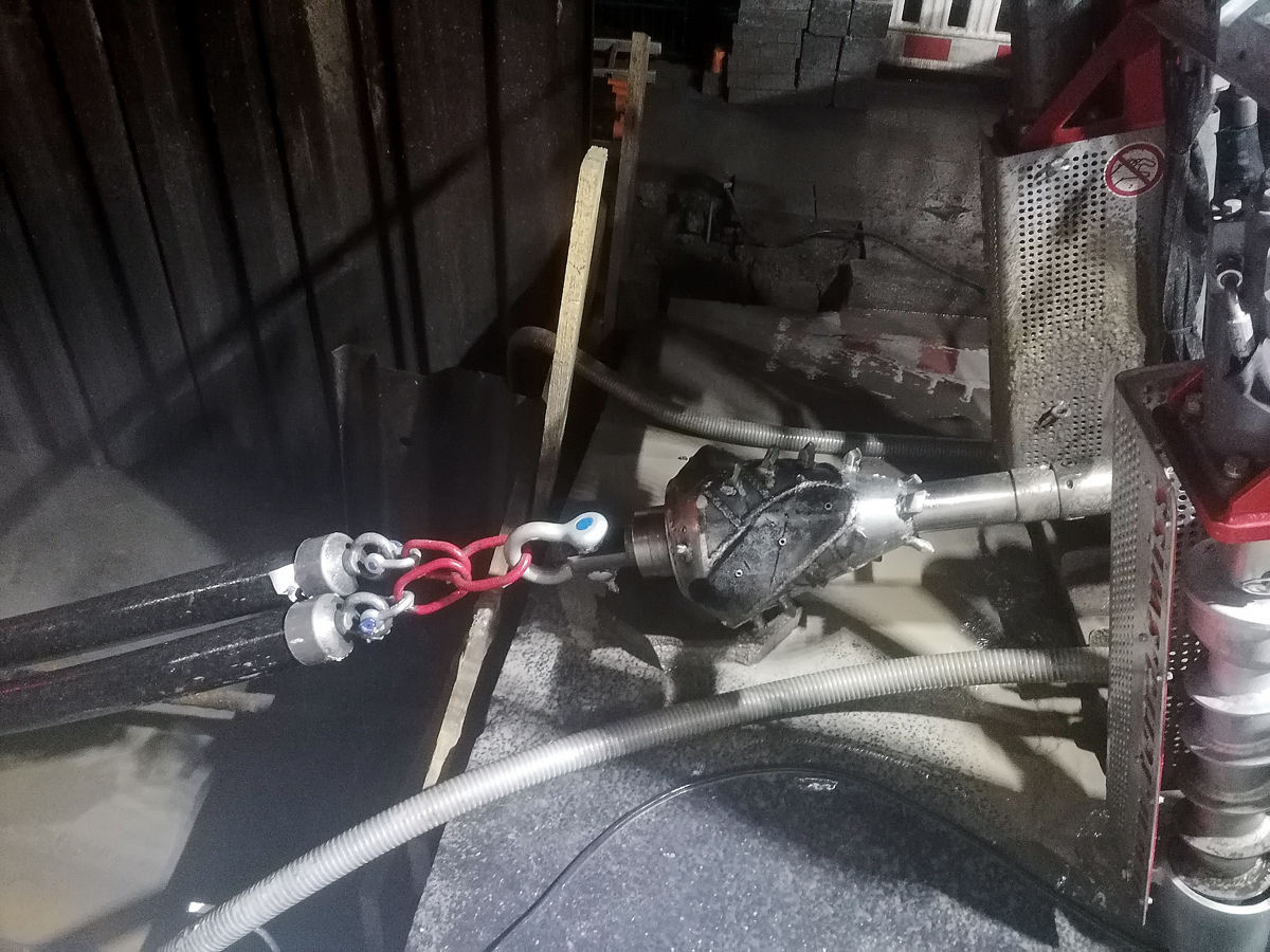 Für die Zwischenaufweitung und für das erneute Durchstoßen des Push-Räumers war vor Ort ein weiterer Arbeitstag vorgesehen. Das ausführende Bohrunternehmen entschied sich hier für den Einsatz eines 355-mm-Fluted-Räumers, um für die 2 x 125 mm HDPE-Rohre auch ausreichend Ringspalt zu gewährleisten. Das hohe Drehmoment von 8 000 Nm sowie die elektronische Einzugautomatik ADBSe in Kombination mit dem Auto-Tork regeln nach Herstellerangaben die Einzugsgeschwindigkeit dem Untergrund angepasst innerhalb von Millisekunden.