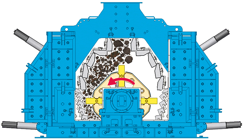 Das Gehäuse, der Rotor und der gesamte Brechraum des Variopactors sind symmetrisch aufgebaut. So kann der Rotor in beide Richtungen betrieben und seine Drehrichtung jederzeit geändert werden. Durch die Nutzung beider Drehrichtungen werden die Schlagleisten stets mit einer scharfen Brechkante betrieben und Schlagleistenwechsel bzw. -drehungen können auf ein Minimum reduziert werden. Der Variopactor ist wartungsfreundlich aufgebaut, alle Verschleißteile sind leicht zugänglich und lassen sich schnell austauschen.