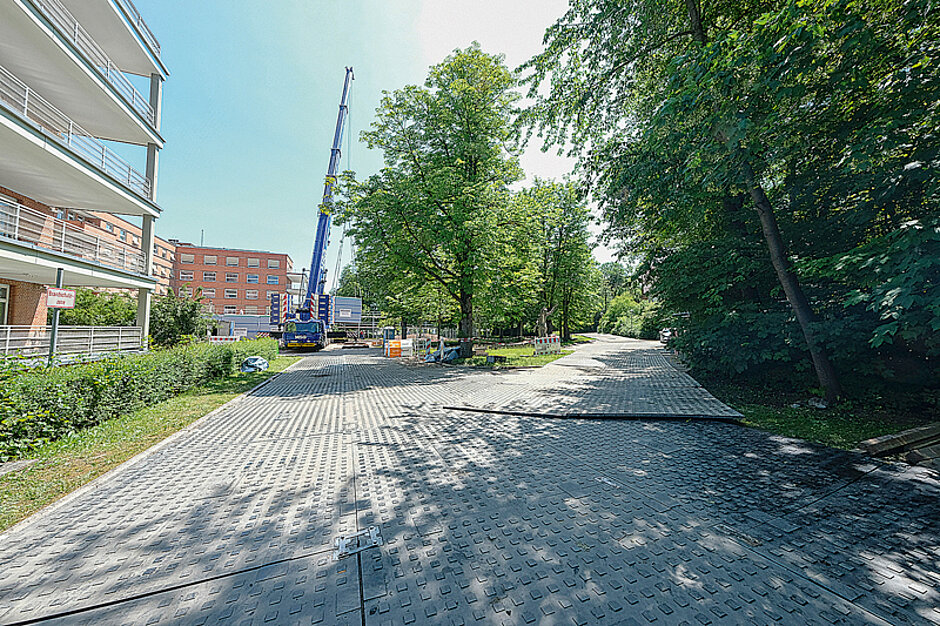„Das Gelände und die vorhandenen Gebäude wurden im Stil der 1920er-Jahre errichtet und 1935 als Chirurgische Klinik eröffnet und stehen heute unter Denkmalschutz«, so Andreas Wiegel, Universitätsklinikum Tübingen. Neben dem geschützten Baumbestand galt es vor allem, das parkähnliche Gelände, aber auch die gepflasterte Zufahrt zu schützen. Ein nicht ganz einfaches Unterfangen bei einem Gesamtgewicht von 65 t bis 75 t bei den Schwertransportern, die je ein Bettenmodul zur Einbaustelle transportierten. Zudem verfügte der für das Einheben der Module nötige Mobilkran über eine Traglast von 400 t.